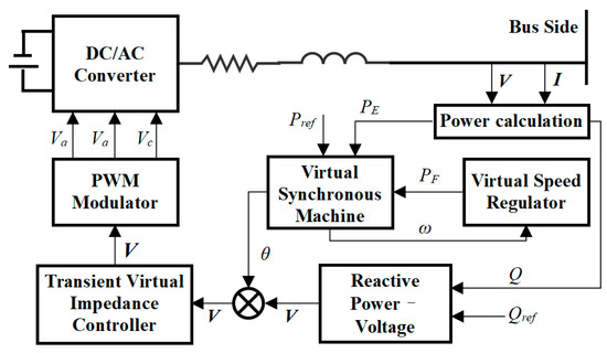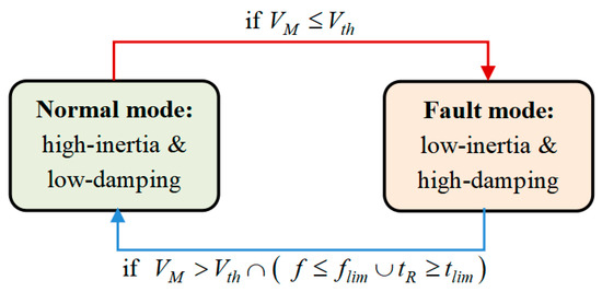 In power systems with a high penetration of renewable energy, integrating battery energy storage systems can enhance frequency regulation capabilities. However, in “islanded” operation mode, the lack of large grid interconnection support may cause significant frequency fluctuations or even instability when the system faces fault disturbances. To ensure the dynamic stability of the grid-forming energy storage system, this paper proposes a virtual synchronous machine (VSM) control parameter tuning and adaptive switching strategy. A control model is developed, which incorporates virtual inertia, damping, droop control, and transient virtual impedance. An optimization model for control parameter tuning is established for two typical disturbances: generator disconnection and three-phase symmetrical short-circuit fault. Additionally, a control parameter adaptive switching mechanism is designed based on voltage threshold and recovery time criteria. The application of this method to a simulation of an islanded power system demonstrates that high damping (e.g., greater than 15 pu) is suitable for generator disconnection disturbances, while a combination of low inertia (0.1 s) and high damping (50 pu) is appropriate for three-phase short-circuit disturbances. The control parameter tuning for three independent and aggregated scenarios successfully achieves effective frequency support. The adaptive switching criteria are set with a voltage threshold of 0.4 pu and a recovery time of 2 s, ensuring that the system frequency recovers within the specified range (48.5–51.5 Hz) within 1 s under short-circuit disturbance. The proposed method shows great potential for improving the operational stability of grid-forming energy storage systems. Full article