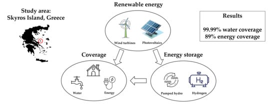 The aim of this study is to evaluate the technical performance and resilience of a Hybrid Renewable Energy System (HRES), designed to achieve water and energy autonomy on a Skyros Island, Greece. The system integrates renewable energy sources with multiple storage technologies. A high-resolution, 30-min simulation was developed, incorporating 10 years of historical weather data to model the operation of an HRES, which consists of wind turbines, photovoltaics, pumped hydro storage, and green hydrogen production. Reverse osmosis was used for desalination, and extended low-wind conditions were simulated to assess system resilience. Results indicate that the proposed system is, in fact, capable of meeting 89% of the annual energy demand and 99.99% of freshwater requirements by means of desalination. Wind power accounted for 53% of the total energy production, photovoltaics 2%, while pumped hydro and hydrogen storage contributed 17% and 6%, respectively. During artificially imposed windless periods, short-term deficits were addressed by the use of pumped hydro, while hydrogen ensured supply continuity in the final days, thereby demonstrating their complementary function. In this resilience stress-test, the system remained operational for 10 days during an artificial windless period, demonstrating the critical role of hybrid storage. The findings indicate that a combination of renewable energy with diversified storage and water management strategies can provide a reliable and self-sufficient water–energy nexus for remote islands. Finally, the novelty of this research work lies in the statistical analysis of calm-wind events and the development of the corresponding power-law relationship, conducted under the framework of the 30-min simulation. Full article