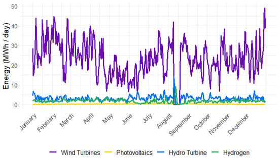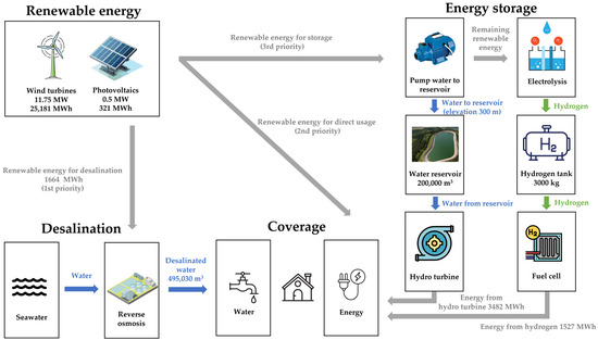 Modeling Water–Energy Autonomy on Remote Islands Through Hybrid RES, Pumped Hydro, and Hydrogen Storage Considering Low-Wind Conditions