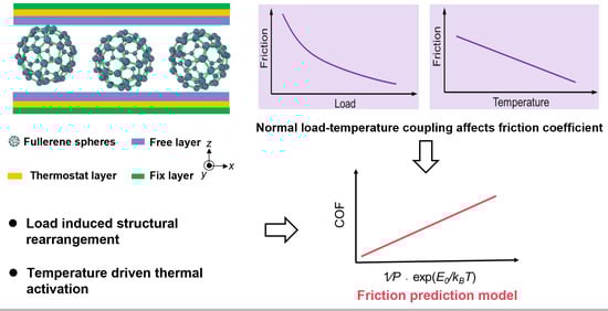 This study employs molecular dynamics simulations to investigate the frictional behavior of fullerene nano-additives on Fe-C alloy surfaces under varying loads and temperatures, focusing on boundary lubrication conditions. The results show that the x-direction friction force exhibits minimal sensitivity to normal pressure due to the high rigidity of fullerene molecules, which limits variations in real contact area and atomic interactions. In contrast, temperature has a significant effect: as it rises, enhanced atomic vibrations and thermal activation lower energy barriers for sliding. The coefficient of friction (COF) consistently decreases with both increasing load and temperature, driven by the mechanism of thermally activated motion. Although partial rotational motion from sliding to rolling friction was not explicitly observed in the simulations, the study remains within the sliding-dominated regime, highlighting the importance of temperature over load in controlling friction. A linear relationship between lnCOF and 1/kBT yields an average activation energy of ~0.03 eV, supporting a thermally activated friction mechanism. By introducing a composite parameter that combines load and temperature effects, the study provides a predictive framework for modeling friction behavior under thermo-mechanical coupling. These findings enhance the understanding of the friction-reducing capabilities of fullerene additives and offer a foundation for designing advanced nano-lubricants in boundary lubrication systems. Full article