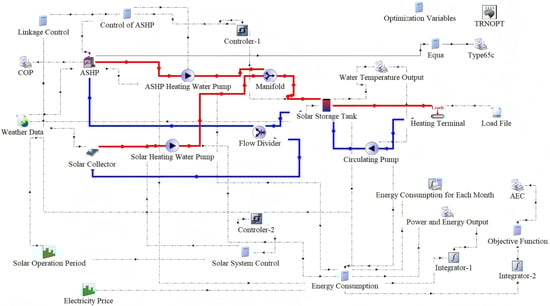 Building energy consumption is a major source of carbon emissions, with the heating energy demand of rural buildings in the hot summer and cold winter (HSCW) zone having increased 575-fold over the past 15 years. This research investigated an optimized solar–air source heat pump (SASHP) system to meet the heating demand of rural residences in this region. First, a typical rural building model was developed using SketchUp, and its heating load was simulated using TRNSYS, revealing an average load of 3.38 kW and a peak load of 5.9 kW. Based on the latest technical standards, the SASHP system was designed and simulated using TRNSYS, achieving an overall coefficient of performance (COP) of 3.67 while maintaining indoor thermal comfort within ISO 7730 Category II. Subsequently, the system was optimized through GenOpt to minimize the annual equivalent cost, yielding key parameters: a 15 m2 solar collector at a 40.75° tilt, a 0.35 m3 water tank, and a 10.16 kW air source heat pump. Compared with the initial design, the optimized configuration achieved reductions of 35.60% in initial investment and 32.68% in annual equivalent costs. By ensuring thermal comfort and overcoming the economic barrier, this study provides a viable pathway for adoption and promotion of renewable heating technology in rural areas. Full article