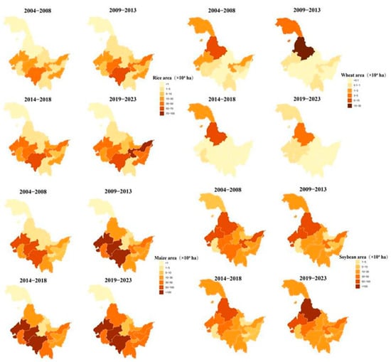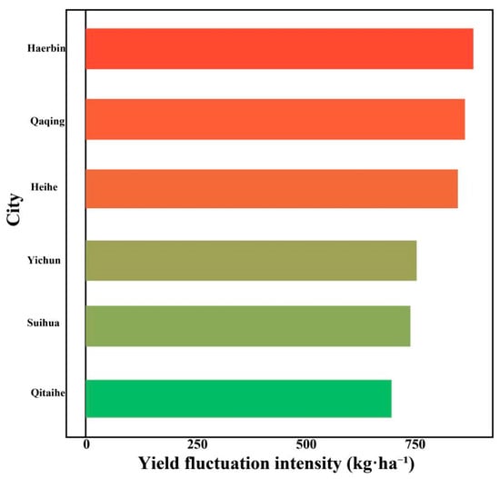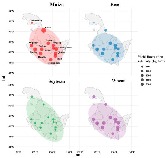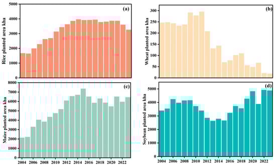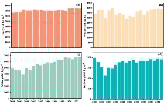 Heilongjiang Province is China’s largest commercial grain-producing base, meaning that understanding the stability and climatic sensitivity of its major crops are essential for national food security. Using statistical and meteorological data from 2004 to 2023, this study systematically examines the impacts of climate change on cropping structure, yield dynamics, and production stability. The results show that over two decades the total grain crops-sown area and the yield per unit area increased by 79.4% and 38.4%, respectively. The cropping pattern shifted from a diversified structure to a maize-soybean-rice dominated pattern, while the wheat area declined by 92.2%. Additionally, mean and extreme yield fluctuations decreased by 52.3% and 42%, respectively. Rice exhibited the highest yield stability, whereas maize and soybeans experienced marked reductions in interannual variability. Spatial analysis identified Harbin and Daqing as hotspots for yield stability risk, characterized by higher yield standard deviations relative to other cities in the province. Climate elasticity analysis revealed that soybeans and rice were sensitive to warming, while wheat responded positively to increased rainfall. Overall, Heilongjiang’s grain production system has expanded and become more stable at the provincial scale, but it remains vulnerable to emerging climatic risks. Strengthening climate adaptation through crop-specific management, varietal improvement, and field water regulation is vital for enhancing system resilience and sustaining food production in cold-region agroecosystems. Full article
