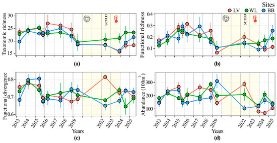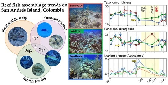 Long-term monitoring is essential for understanding how recurring disturbances, such as hurricanes and coral bleaching, affect reef fish communities and ecosystem processes. This study evaluates temporal trends (2013–2025) in fish assemblage composition, functional diversity, and nutrient excretion proxies (C, N, and P) across three reef sites on San Andrés Island in the Colombian Caribbean. Our results reveal significant shifts in community structure following major disturbances in 2020 (Hurricanes Eta, Iota) and 2023 (mass bleaching event). Taxonomic and functional richness (TRich, FRich) fluctuated throughout the study period, whereas functional divergence (FDiv) declined earlier (2016), highlighting site-specific differences. A trait-based nutrient-excretion proxy (NPC composite score) identified key species that maintain nutrient cycling. Despite recent coral bleaching, certain sites exhibited functional resilience, sustained by the persistence of high-performing nutrient providing species. However, the overall disconnect between taxonomic recovery and functional stability suggests that ecosystem-level processes remain vulnerable, even when species richness appears to recover. This highlights the importance of integrating functional traits and nutrient recycling proxies into monitoring programs to better predict long-term variability in San Andrés Island reefs under a changing climate. Our findings provide a framework for prioritizing management efforts in the Seaflower Biosphere Reserve with emphasis on maintaining ecosystem services. Full article