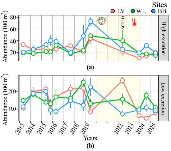 Long-term monitoring is essential for understanding how recurring disturbances, such as hurricanes and coral bleaching, affect reef fish communities and ecosystem processes. This study evaluates temporal trends (2013–2025) in fish assemblage composition, functional diversity, and nutrient excretion proxies (C, N, and P) across [...] Read more.