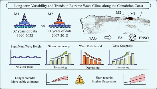 Detecting long-term changes in extreme wave climate is essential for coastal engineering and hazard assessment, yet robust trend identification remains challenging due to strong natural variability and limited observational records. This study evaluates the robustness of trend detection in wave conditions along the [...] Read more.