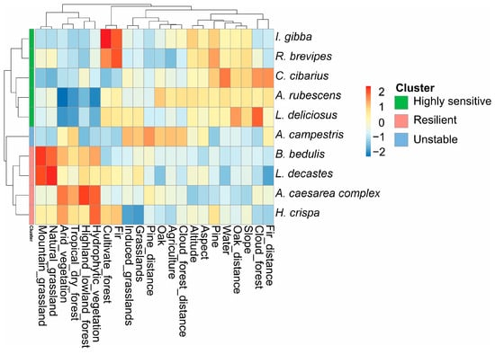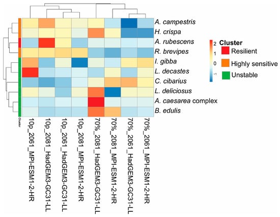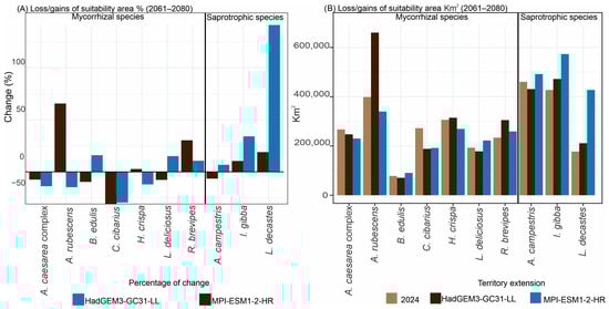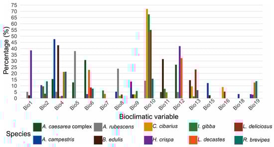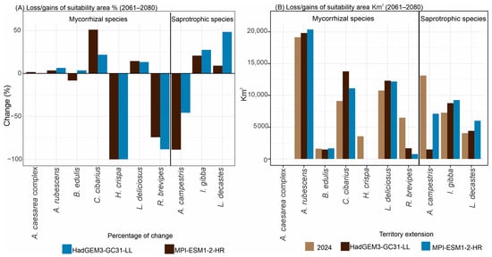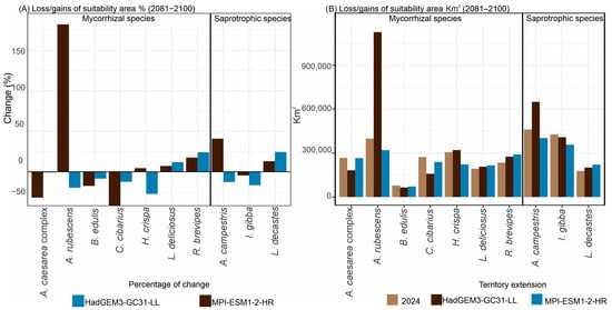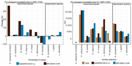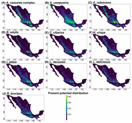 Climate change is reshaping climatic regimes worldwide, with direct consequences for species distributions and ecosystem services, including those provided by wild edible fungi. In Mexico, these fungi represent a resource of ecological, cultural, and economic importance, yet their vulnerability to future climate scenarios remains poorly understood. This study evaluated projected changes in the potential distributions of ten frequently consumed edible fungal species in central Mexico under current and future climate scenarios (2061–2080 and 2081–2100). Ecological niche models were performed using Maxent with 19 bioclimatic variables, spatial block cross-validation, and model tuning based on the AICc and partial ROC curves. Additionally, associations between species suitability and land use and vegetation variables were assessed through multivariate analyses. The most influential predictors were the mean temperature of the warmest quarter (71.929%), temperature seasonality (47.589%), and annual precipitation (41.962%). Current models identify high environmental suitability primarily within the TMVB, Sierra Madre Occidental, and southern mountainous regions such as Chiapas. Future projections revealed heterogeneous, species-specific responses. Suitability gains were projected for Cantharellus cibarius (21–50%), Infundibulicybe gibba (20–34%), Lactarius deliciosus (13–48%), and Lyophyllum decastes (8–141%), whereas Helvella crispa (1–99%), Agaricus campestris (2–88%), and Russula brevipes (74–100%) showed marked contractions under high-emission scenarios. These contrasting patterns suggest that climate change may restructure the spatial availability of edible fungi in Mexico, potentially affecting forest sustainability and the biocultural practices of communities that depend on these resources. Integrating species-specific climatic sensitivity into conservation and sustainable management strategies will be essential under future climate conditions. Full article