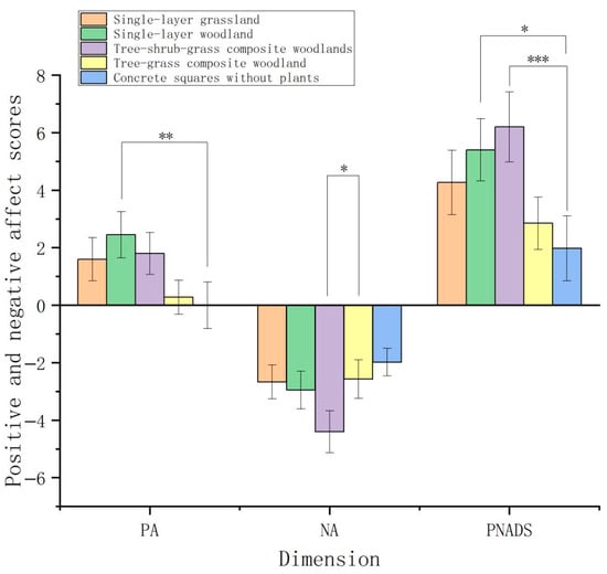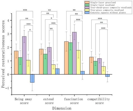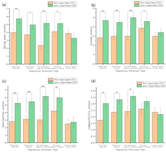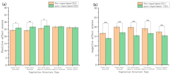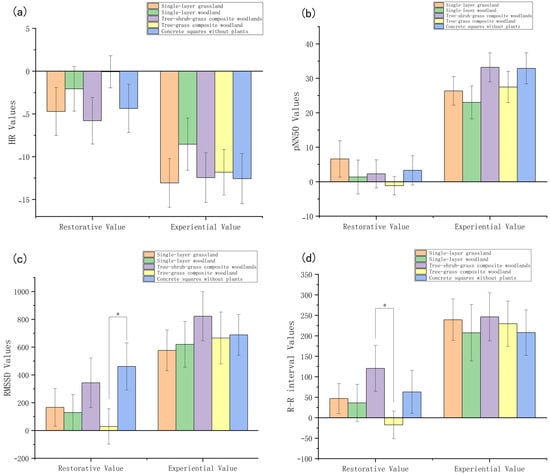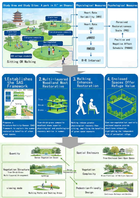 Amidst global urbanization and rising psychological stress, urban green spaces are increasingly recognized as critical infrastructure for sustainable urban development and public health. However, the mechanisms by which summer vegetation structure mediates both physiological and psychological restoration, and the interplay between these two dimensions, remain poorly understood. Understanding these mechanisms is essential for designing sustainable, health-promoting urban environments that can support growing urban populations in a warming climate. This study employed a controlled field experiment in Xi’an during summer to examine the effects of five vegetation structure types (Single-Layer Grassland, single-layer woodland, tree–shrub–grass composite woodland, tree–grass composite woodland, and a non-vegetated square) on university students’ physiological (heart rate variability) and psychological (perceived restorativeness and affective states) restoration. Following stress induction, 300 participants engaged with the green spaces through both quiet sitting and walking. The results revealed three key findings: (1) the tree–shrub–grass composite woodland consistently showed the most favorable trends other vegetation types across all psychological restoration dimensions, while also showing favorable trends in physiological recovery, underscoring the importance of structural complexity for restorative quality; (2) walking significantly enhanced physiological recovery compared to seated observation across all settings, confirming the role of physical activity as a critical activator of green space benefits; (3) correlation analysis identified a specific cross-system association: the R-R interval recovery value showed a weak but significant correlation with positive affect (PA) scores, suggesting that physiological calmness and positive emotional experience are linked, yet their weak coupling under short-term exposure indicates they may operate as parallel processes with distinct temporal dynamics. These findings indicate that the restorative potential of summer green spaces emerges from an integrated framework combining vegetation complexity and activity support. We propose that future sustainable landscape design should prioritize multi-layered vegetation structures as nature-based solutions that simultaneously enhance human well-being and urban resilience. These findings provide empirical evidence for integrating health-promoting green infrastructure into sustainable urban planning frameworks, supporting multiple Sustainable Development Goals (SDGs), including SDG 3 (Good Health and Well-being), SDG 11 (Sustainable Cities and Communities), and SDG 13 (Climate Action). Full article