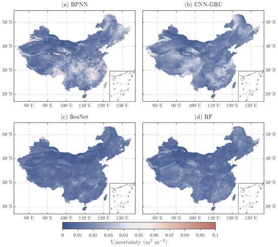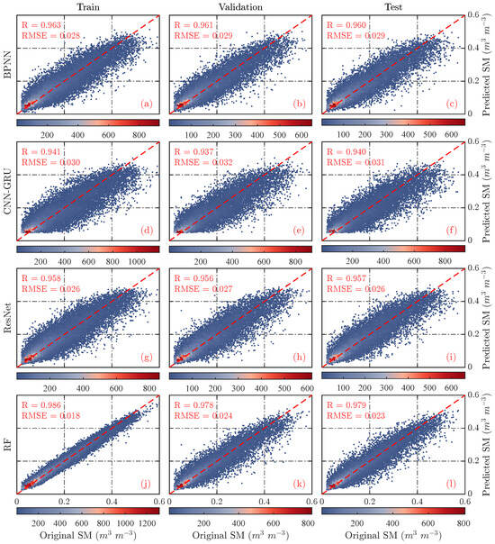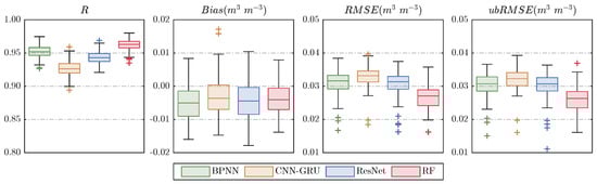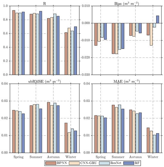 As a key parameter of the Earth’s ecosystem, soil moisture significantly influences land-atmosphere interactions and has important applications in meteorology, hydrology, and agricultural studies. However, existing passive microwave remote sensing products of soil moisture are limited by their discontinuous temporal coverage and relatively coarse spatial resolution (typically 25–55 km), which cannot meet the requirements for fine-scale applications. This study developed and compared four machine learning-based downscaling approaches to improve the spatiotemporal resolution of MCCA SMAP soil moisture products. The methodology involved establishing complex nonlinear relationships between soil moisture and various high-resolution surface parameters including albedo, evapotranspiration, precipitation, and soil properties. High-resolution soil moisture maps were generated by leveraging the scale-invariant characteristics between soil moisture and surface parameters, followed by comprehensive evaluation using in situ ground observations and triple collocation analysis. The results demonstrated that all downscaling models showed excellent consistency with original MCCA SMAP observations (R > 0.93, RMSE < 0.033 m3 m−3), while successfully providing enhanced spatial details. The Random Forest (RF) model exhibited superior performance, showing higher correlation coefficients and lower biases when compared with in situ measurements. Uncertainty analysis revealed relatively low uncertainty levels for all models except Backpropagation Neural Network (BPNN) model. The RF-downscaled products accurately tracked temporal variations of soil moisture and showed good responsiveness to precipitation patterns, demonstrating their potential for fine-scale hydrological applications and regional environmental monitoring. Full article