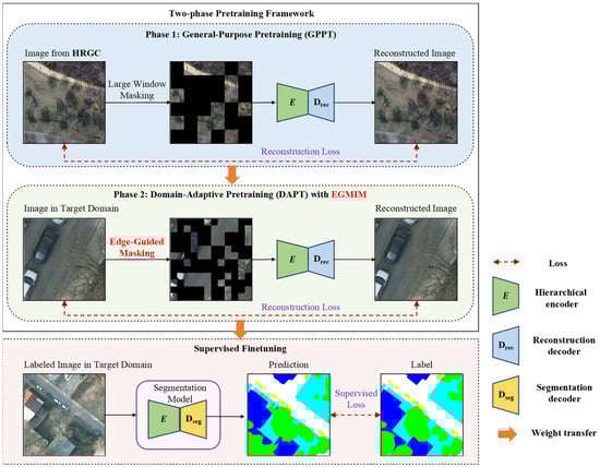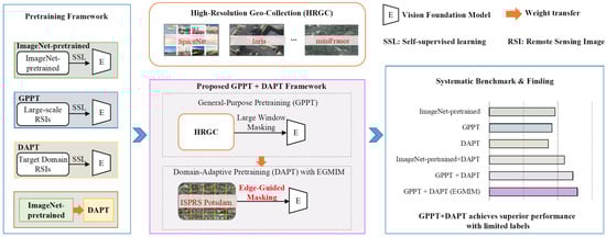 This paper addresses the critical challenge of semantic segmentation for remote sensing images (RSIs) under extremely limited labeled data. A high-quality initial model is paramount for downstream semi-supervised or weakly supervised learning paradigms, as it mitigates error propagation from the outset. We conducted a systematic investigation into self-supervised pretraining to serve this precise need. Within the low-label regime, we identify and tackle two pivotal factors limiting performance: (1) the domain shift between large-scale pretraining data and specific target tasks, and (2) the deficiency in local feature learning caused by large-window masking in visual foundation model (VFM) pretraining. To resolve these issues, we first benchmark various pretraining strategies, demonstrating that a two-phase General-Purpose Pretraining (GPPT) followed by Domain-Adaptive Pretraining (DAPT) framework is optimal, significantly outperforming both single-phase methods and the existing two-phase paradigm initialized from ImageNet. Subsequently, we propose an Edge-Guided Masked Image Modeling (EGMIM) method for the DAPT phase, which explicitly integrates edge priors to guide the masking and reconstruction process, thereby enhancing the model’s capability to capture fine-grained local structures. Extensive experiments on four RSI benchmarks validate the effectiveness of our approach, showing consistent and substantial gains, particularly in extreme low-label scenarios. Beyond empirical results, we provide in-depth mechanistic analyses to explain the synergistic roles of GPPT and DAPT. Full article