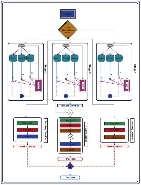 Purpose: Gastrointestinal (GI) illness demands precise and efficient diagnostics, yet conventional approaches (e.g., endoscopy and histopathology) are time-consuming and prone to reader variability. This work presents GID-Xpert, a deep learning framework designed to improve feature learning, accuracy, and interpretability for GI disease classification. Methods: GID-Xpert integrates a hierarchical, multi-stage attention-driven mixture of experts with dynamic routing. The architecture couples spatial–channel attention mechanisms with specialized expert blocks; a routing module adaptively selects expert paths to enhance representation quality and reduce redundancy. The model is trained and evaluated on three benchmark datasets—WCEBleedGen, GastroEndoNet, and the King Abdulaziz University Hospital Capsule (KAUHC) dataset. Comparative experiments against state-of-the-art baselines and ablation studies (removing attention, expert blocks, and routing) are conducted to quantify the contribution of each component. Results: GID-Xpert achieves superior performance with 100% accuracy on WCEBleedGen, 99.98% on KAUHC, and 75.32% on GastroEndoNet. Comparative evaluations show consistent improvements over contemporary models, while ablations confirm the additive benefits of spatial–channel attention, expert specialization, and dynamic routing. The design also yields reduced computational cost and improved explanation quality via attention-driven reasoning. Conclusion: By unifying attention, expert specialization, and dynamic routing, GID-Xpert delivers accurate, computationally efficient, and more interpretable GI disease classification. These findings support GID-Xpert as a credible diagnostic aid and a strong foundation for future extensions toward broader GI pathologies and clinical integration. Full article