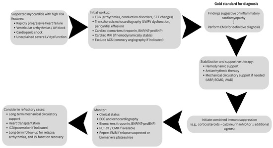 Background: Giant cell myocarditis (GCM) is a rare condition with an incompletely understood immune pathogenesis, characterized by inflammatory damage to the myocardium and the presence of multinucleated giant cells on histopathological examination. The frequently fulminant and severe course requires rapid intervention for a correct diagnosis and the initiation of immunosuppressive therapy, which is often life-saving. Materials and methods: This article contains information from observational studies and case reports, systematically collected from prestigious publications such as JACC, NEJN, ESC, JCC, Heliyon, and Cureus found in the PubMed and ClinicalTrials.gov databases. Thus, 25 patients diagnosed with giant cell myocarditis between March 2019 and May 2025 were analyzed, with a focus not only on the initial clinical evolution, mortality incidence, and the need for heart transplantation but also on the incidence of major complications such as cardiogenic shock and malignant rhythm and conduction disorders refractory to drug treatment. These parameters were studied according to certain intrinsic factors that cannot be influenced, such as age at onset, gender, and associated pathology of the patient, as well as extrinsic factors that can be influenced, such as the time of diagnosis and the start of immunosuppressive therapy. The results obtained were compared with those in the literature from previous years, considering the limitations of the current study. Results: The selected patients were 13 women (52%) and 12 men (48%), mostly from the US and Japan, aged between 22 and 76 years, with an average age of 44.92 years. An associated autoimmune pathology was found in 40% of patients in this group, and previous cardiovascular pathology in 28%. Only 8% had a history of GCM. The clinical onset of new-onset heart failure, refractory to usual therapy, with progressive dyspnea as the cardinal symptom was found in 12 patients, representing 48% of cases; palpitations as an expression of rhythm or conduction disorders were found in five patients, representing 20%; precordial discomfort to precordial pain accompanied or not by ST-T segment changes was present in four patients, representing 16%; and general signs and symptoms or those of other organs were present in three (12%) cases. The diagnosis was made by histological examination of the biopsy fragment obtained by endomyocardial biopsy or from the myocardial fragment obtained during the implantation of mechanical cardiovascular support devices and, less frequently, on the explanted heart and at autopsy. In terms of progression, of the 25 patients, four (16%) died, four (16%) required heart transplantation, and 16 (64%) had a severe progression with cardiogenic shock, which required mechanical circulatory support in 11 (44%) cases. The outcome was mainly influenced by the early diagnosis and administration of immunosuppressive medication, but also by the age of the patients and associated chronic diseases. Conclusions: Giant cell myocarditis is a serious condition that, in the absence of rapid diagnosis and appropriate immunosuppressive therapy, has a fulminant, often fatal course. Clinical suspicion of giant cell myocarditis remains important in the initial diagnosis. Raising this suspicion, together with modern and improved paraclinical investigations compared to previous years, has led to faster diagnosis and administration of immunosuppressive therapy in this pathology. Histological examination remains the gold standard for final diagnosis, but it should be noted that it may be non-diagnostic. In the face of a strong suspicion of giant cell myocarditis, the best approach is to start immunosuppressive therapy and monitor the patient’s progress. Immunosuppressive treatment remains decisive in influencing the evolution of this condition, both through prompt administration and through the adaptation of therapeutic regimens to the evolution of patients. A more detailed understanding of the immune-mediated pathogenesis of GCM and the identification of clinical risk factors for unfavorable short- and long-term outcomes may enable earlier risk stratification and the development of more targeted, individualized therapeutic strategies.