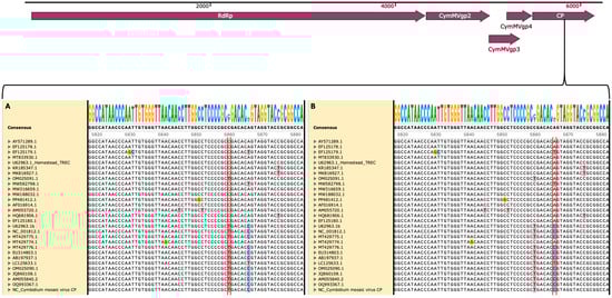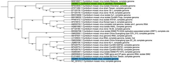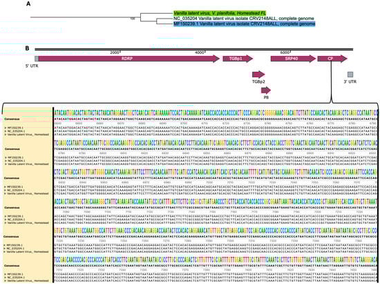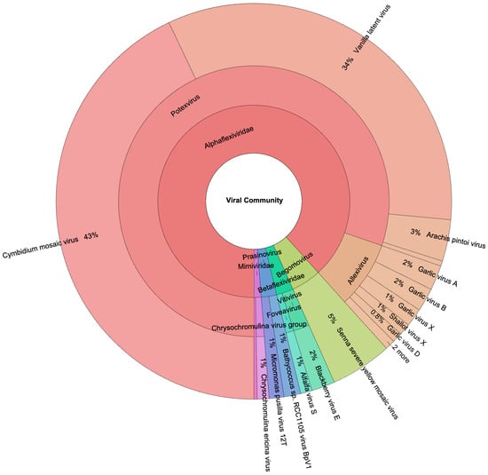 Vanilla planifolia, a high-value tropical orchid, is significantly impacted by viral pathogens that threaten its cultivation and productivity. This study employs metagenomic techniques to detect and characterize the viral communities associated with V. planifolia in South Florida. Using high-throughput RNA sequencing, the Cymbidium mosaic virus (CymMV) and Vanilla latent virus (VLV) were prevalent in the plant system, with CymMV being the dominant viral species. Phylogenetic analysis of the CymMV coat protein gene revealed notable genetic divergence in the Homestead isolate, forming a distinct clade from global reference strains, suggesting local adaptation or host-specific evolution. Viral distribution across the plant system revealed higher viral loads in stem tissue, consistent with their role in systemic transport, whereas leaves exhibited greater viral richness, likely due to increased environmental exposure. The low abundance of other viral species, including Garlic viruses and Senna severe yellow mosaic virus, suggests that V. planifolia may harbor a broader range of viral taxa than previously characterized, though these findings represent a preliminary survey of symptomatic plants rather than a comprehensive regional assessment. This study underscores the value of metagenomic approaches for uncovering both well-characterized and novel viruses in plant systems and highlights the need for expanded sampling and continuous viral surveillance to guide disease management strategies in economically important crops such as vanilla. Full article