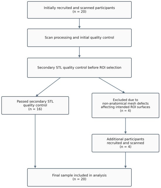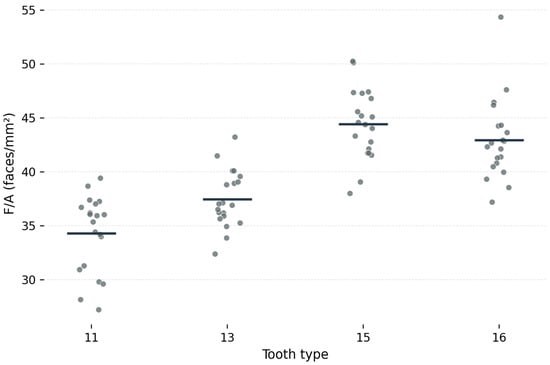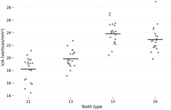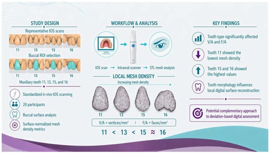 Background/Objectives: The quality of intraoral scanner-derived digital models depends not only on deviation-based accuracy, but also on how scanned surfaces are reconstructed into a polygonal mesh. The aim of this prospective within-subject observational study was to evaluate whether tooth morphology influences local mesh density distribution in intraoral scanner-derived STL models of selected maxillary teeth. Methods: Twenty participants underwent maxillary intraoral scanning using a Medit i900 wired intraoral scanner under standardized clinical conditions. For each participant, the buccal surfaces of the maxillary right central incisor (11), canine (13), first premolar (15), and first molar (16) were selected as regions of interest. Surface area (A), number of vertices (V), and number of faces (F) were recorded, and the surface-normalized mesh density parameters vertices per unit area (V/A) and faces per unit area (F/A) were calculated. Comparisons among tooth types were performed using repeated-measures analysis of variance (ANOVA) with Bonferroni post hoc correction. Results: Significant differences were found among tooth types for both V/A and F/A (p < 0.001). Mean V/A values were 18.2 ± 1.9 for tooth 11, 19.8 ± 1.4 for tooth 13, 23.8 ± 1.7 for tooth 15, and 22.9 ± 2.0 vertices/mm2 for tooth 16. Mean F/A values were 34.3 ± 3.6, 37.5 ± 2.7, 44.4 ± 3.3, and 42.9 ± 3.8 faces/mm2, respectively. Post hoc comparisons showed significant differences between teeth 11 and 13, 11 and 15, 11 and 16, 13 and 15, and 13 and 16, whereas no significant difference was observed between teeth 15 and 16. Conclusions: Tooth morphology significantly influenced local mesh density distribution in intraoral scanner-derived STL models of selected maxillary teeth. These findings suggest that local anatomical form affects STL mesh reconstruction under standardized in vivo scanning conditions and support local mesh density analysis as a useful complementary approach to conventional deviation-based digital assessment. Full article