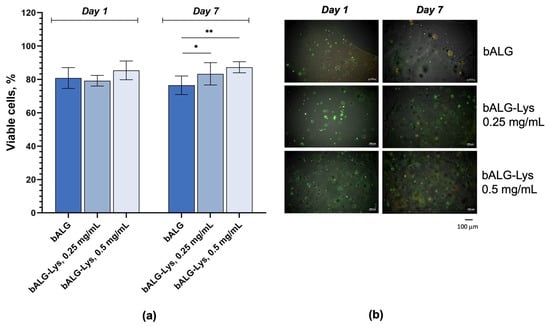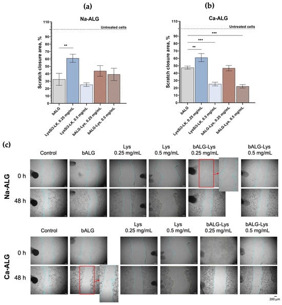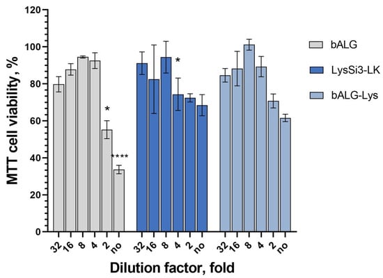 Due to their availability and environmental friendliness, alginate polymers are widely used in pharmaceuticals and cosmetics. The most common type of alginate is derived from seaweed and is used to develop topical dosage forms, among other things. However, variability in the seaweed material can lead to instability in the physicochemical parameters. Biotechnologically produced alginate minimizes this drawback through controlled synthesis. However, unlike algal alginates, the safety profile of such polymers has not been well studied. When developing dosage forms intended for wound surfaces, safety is of primary importance. In this study, we developed enzybiotic compositions based on bacterial alginate as an excipient and a novel recombinant modified endolysin, LysSi3-LK, as an antibacterial agent, and assessed their antibacterial properties and safety profile. The study included an in vitro evaluation of the activity spectrum, as well as the cytotoxicity and biocompatibility, of gel and hydrogel compositions. It was demonstrated that bacterial alginate is acceptable for the encapsulation of endolysin. It exhibited medium cytotoxic effects on the HaCaT cells, which were significantly reduced by the LysSi3-LK addition. The migration of cells was diminished following exposure to the gel and hydrogel formulations. However, an improvement in biocompatibility was observed in the cell proliferation assay. Full article