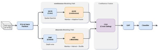 Hyperspectral image (HSI) classification is a core task in remote sensing data interpretation. Although recently introduced state space models (SSMs), such as Mamba, have demonstrated promising performance in hyperspectral analysis due to their linear computational complexity and strong long-sequence modeling capability, existing single-stream scanning mechanisms struggle to effectively balance the intrinsic spectral continuity dependency and the high-dimensional redundancy inherent in HSI data. Moreover, they often suffer from representation discrepancies when fusing features from heterogeneous representation spaces. To address these challenges, we propose a continuous–discrete collaborative framework, termed Confluence Mamba (CF-Mamba). Specifically, the continuous modeling path (AHSE) introduces a multi-view adaptive routing mechanism to accurately capture anisotropic spectral–spatial continuous evolution patterns. Simultaneously, the discrete interaction path (IISE) employs interval sampling and channel shuffling strategies to efficiently decouple high-dimensional redundancy while maintaining fine-grained feature interactions. Furthermore, the confluence gating unit (CGU) leverages a bidirectional cross-modulation mechanism to constrain discrete feature distributions using continuous contextual information, effectively alleviating representation discrepancies during multi-scale feature fusion. Extensive experiments conducted on four benchmark datasets, namely, Indian Pines, Pavia University, Houston, and WHU-Hi-Longkou, demonstrate that CF-Mamba achieves overall accuracies of 97.77%, 99.68%, 99.06%, and 99.59%, respectively. The proposed method consistently outperforms existing CNN-, Transformer-, and Mamba-based approaches in terms of both classification performance and computational efficiency. Full article