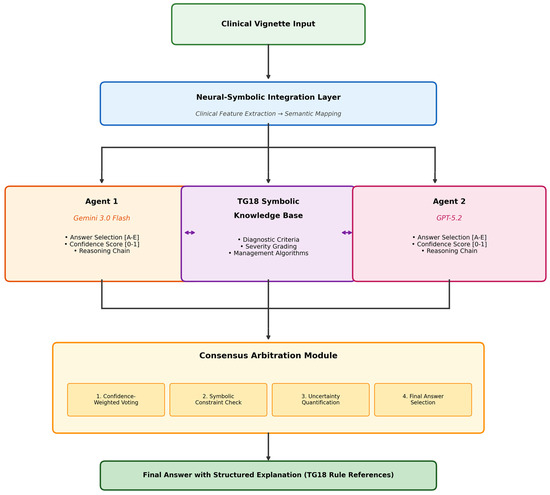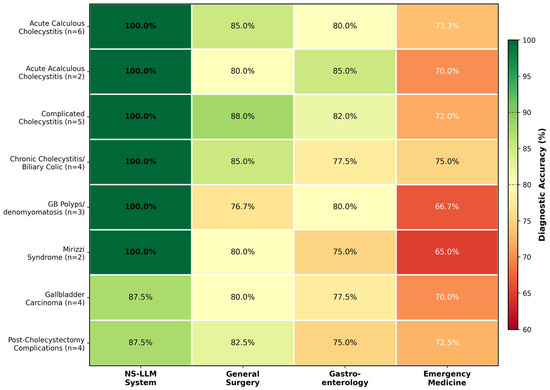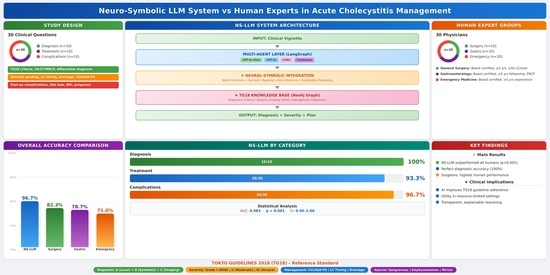 Background/Objectives: Large language models (LLMs) have shown promising results in medical decision support; however, their effectiveness in managing acute cholecystitis and other gallbladder diseases remains insufficiently examined. This study evaluated the performance of a neuro-symbolic LLM system that integrates multiple AI agents with neural–symbolic reasoning for acute cholecystitis management and compared its diagnostic accuracy with that of human expert physicians across three clinical specialties.