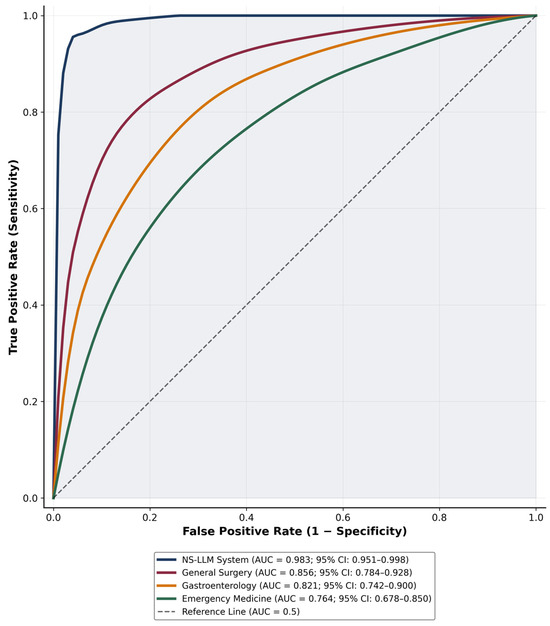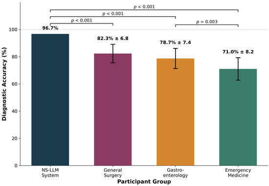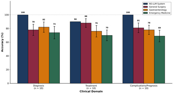 Results: The neuro-symbolic system attained the highest overall accuracy rate of 96.7% (29/30), markedly surpassing the performance of general surgery specialists (average 82.3% ± 6.8%), emergency medicine physicians (average 71.0% ± 8.2%), and gastroenterology specialists (average 78.7% ± 7.4%). Furthermore, the neuro-symbolic system exhibited superior performance across all clinical categories. Among human participants, general surgeons showed the highest accuracy in treatment decisions (88.0%), while gastroenterologists excelled in diagnostic questions (82.0%). Emergency medicine physicians showed comparable performance to other specialties in acute presentation scenarios. ROC analysis revealed excellent discrimination for the neuro-symbolic system (AUC = 0.983) compared to general surgery (AUC = 0.856), gastroenterology (AUC = 0.821), and emergency medicine (AUC = 0.764).