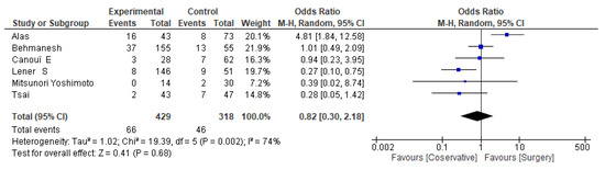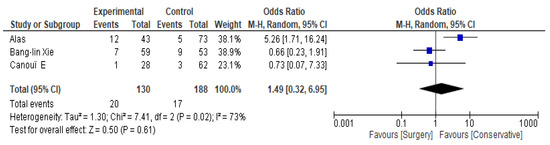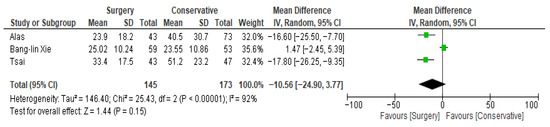 Background/Objectives: The treatment of Hematogenous Primary Septic Spinal Infection (HPSSI) typically involves either conservative management or surgical intervention. Previous studies have suggested that conservative treatment with antibiotics is the mainstay conventional procedure in treating HPSSI, but relevant conclusions remain controversial regarding mortality, recurrence, and hospital stay. There is a lack of systematic reviews and meta-analyses comparing conservative vs. surgical treatment specifically in non-TBC, non-fungal, and non-postsurgical HPSSI in adults. This systematic review and meta-analysis aim to systematically evaluate the therapeutic effectiveness of conservative versus surgical intervention for the management of HPSSI, through a meta-analysis of key outcomes including mortality, recurrence, and length of hospital stay. Methods: A comprehensive literature search was performed across four major databases: PubMed, Cochrane, Science Direct, and Scopus. Using defined inclusion and exclusion criteria, we identified twelve studies encompassing 1199 patients with hematogenous, primary, septic spinal infection, which was not post-surgical, not due to TBC, and not fungal, who were treated conservatively (n = 519) or surgically (n = 680) for inclusion in the meta-analysis. PRISMA guidelines were used for this analysis. The primary outcome analyzed was mortality; secondary outcomes were infection recurrence and length of hospital stay, comparing conservative treatment versus operative intervention for HPSSI. Results: Mortality rates for surgical versus conservative treatment varied across five studies. Some studies reported significantly lower mortality with surgical intervention vs. conservative treatment (2.3–6% vs. 17.8–18%), while others showed no difference (11% for both treatments). This meta-analysis indicates that surgical treatment does not significantly alter mortality rates compared to conservative management, although study heterogeneity is considerable. Infection recurrence was reported in three studies, with rates ranging from 5 to 16.4% for conservative treatment and 5 to 11.6% for surgical intervention. These differences were not statistically significant in studies that provided group-specific data. Findings on hospital length of stay were mixed: two studies reported shorter stays for surgical patients (23.9–33.4 days vs. 40.5–51.2 days), while another study found no meaningful difference between the groups. Across multiple studies, advanced age, frailty, higher comorbidity burden, and neurological impairment were consistently identified as independent predictors of increased mortality, irrespective of treatment modality. Although some data suggest a short-term survival advantage associated with surgical intervention, the overall mortality outcomes remain heterogeneous across the literature. Conclusions: Overall, the findings of this meta-analysis remain inconclusive regarding which treatment—surgical or conservative—is more advantageous in reducing mortality, infection recurrence, and hospital stay. The variability across studies highlights the influence of patient selection, treatment protocols, and local clinical practices. To enhance our understanding and improve outcomes in HPSSI, future randomized controlled trials are essential. These studies should incorporate clear selection criteria, standardized terminology for spinal infection subgroups, and homogenous patient populations with well-defined comorbidities to allow for meaningful data comparisons. Additionally, emphasis should be placed on early diagnosis, rapid identification of causative pathogens, using modern diagnostic tools, and timely initiation of appropriate treatment—whether surgical or conservative—to optimize patient outcomes, including reduced mortality, lower recurrence rates, and shorter hospitalizations. Full article