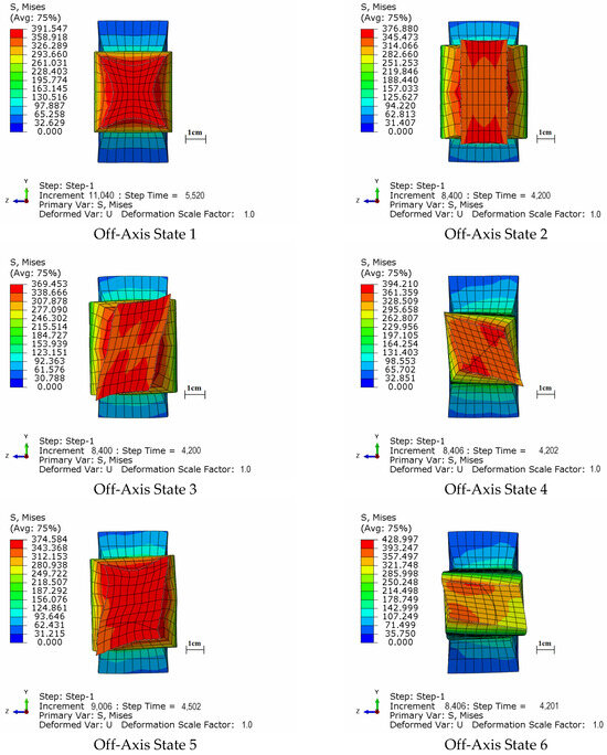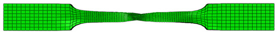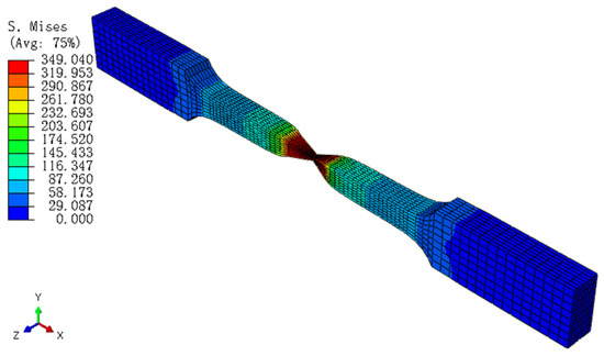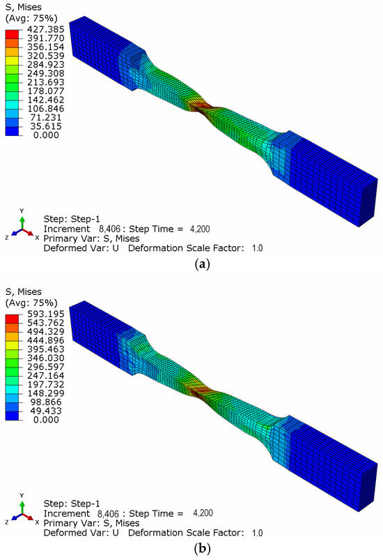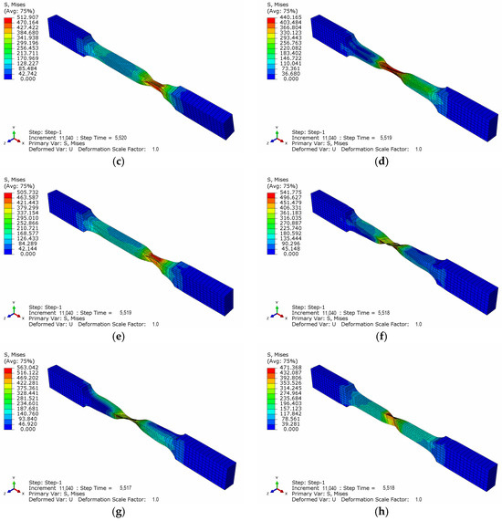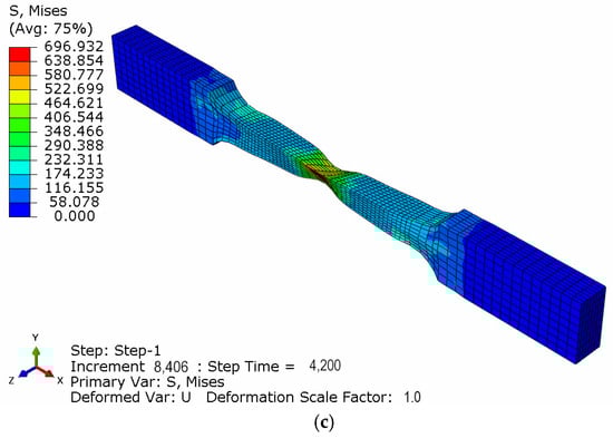 The mechanical behavior, the necking process and the geometry of the neck in rectangular cross-section single-crystal copper specimens under macroscopic uniaxial large-strain tensile conditions were numerically simulated and analyzed using the classical Chaboche combined hardening model and the crystal plasticity constitutive model including the effect of back stress. The simulation results show that, although the classical Chaboche model can simulate the load–displacement curve during the tensile process, it cannot simulate the geometric shape change in the cross-section of the single-crystal copper specimen during the necking process. However, simulation using the crystal plasticity model can not only accurately simulate the macroscopic load–displacement mechanical curves of specimens with different crystal orientations (considering eight off-axis states) but also successfully displays the complex necking morphologies, consistent with experimental observations in the literature for various orientations. The research indicates that the classical Chaboche model lacks the ability to describe the deformation characteristics of single-crystal copper specimens; meanwhile, the crystal plasticity model has a significant advantage in simulating the necking process and characteristics of single-crystal materials under slip mechanisms and can effectively capture the differences in necking morphology caused by the crystal orientation, revealing, to a certain extent, the plastic deformation mechanism in single-crystal metallic materials. Full article