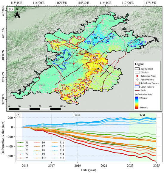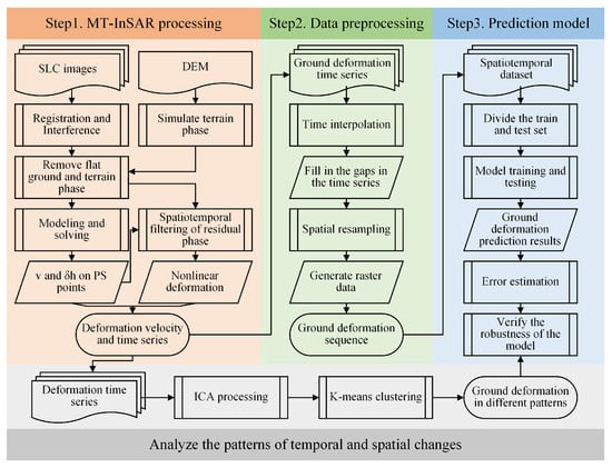 Ground deformation is a major geohazard in many urban areas, requiring reliable monitoring and forecasting for hazard mitigation. Although Multi-Temporal InSAR enables high-resolution deformation monitoring, most prediction approaches rely on single-point modeling and fail to exploit spatial dependencies within deformation fields. This study proposes a spatiotemporally synchronous prediction framework for large-scale InSAR deformation fields, integrating sequence preprocessing, spatiotemporal modeling, and deformation pattern analysis. First-order differencing reduces sequence non-stationarity, while a patch-based encoder-decoder structure preserves spatial topology during dimensionality reduction. The core prediction model, built on PredRNNv2, captures the long-term spatiotemporal evolution of InSAR deformation sequences. In addition, independent component analysis (ICA) combined with K-means clustering identifies dominant deformation patterns and their geological associations. The framework is evaluated using synthetic datasets simulating multiple deformation mechanisms and Sentinel-1 InSAR time-series data over the Beijing Plain from 2015 to 2025. Results show that the model accurately captures deformation evolution and identifies transitions associated with groundwater regulation. These findings demonstrate the potential of deep spatiotemporal learning for large-scale InSAR deformation prediction and geohazard mechanism interpretation. Full article