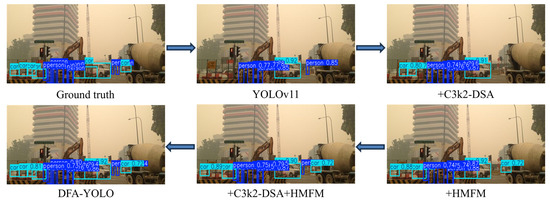 In complex real-world scenarios, object detection faces significant challenges due to severe noise interference and feature degradation. To overcome these limitations, this paper proposes DFA-YOLO, an enhanced YOLOv11 framework integrating three key innovations. First, a Deformable Spatial Attention (DSA) module is introduced into the C3k2 backbone blocks, which dynamically adjusts the receptive field to focus on informative spatial regions. This significantly enhances the model’s adaptability to geometric variations and occluded objects. Second, a Hierarchical Multi-Scale Fusion Module (HMFM) is designed to dynamically recalibrate feature responses across scales, enhancing the model’s perception of multi-scale targets. Third, an improved Wasserstein loss function combines small-object adaptive weighting with dynamic gradient modulation to address boundary ambiguity and scale sensitivity under adverse conditions. Extensive experiments on the RTTS dataset validate the superiority of our approach, achieving improvements of 3.4% and 2.8% in mAP50 and mAP50-95, respectively. Additional experiments on the Exdark dataset confirm the method’s robust generalization capability, with significant accuracy gains observed across all benchmarks. Full article