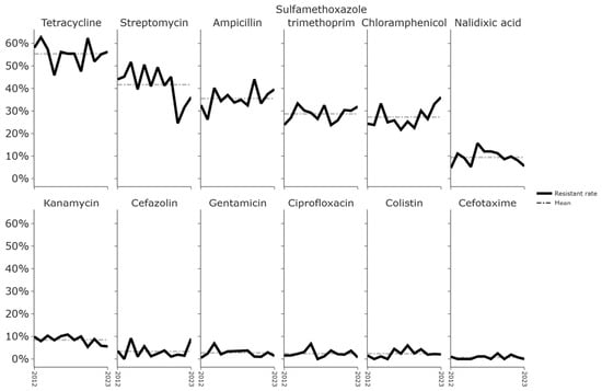 Background/Objectives: The Japanese Veterinary Antimicrobial Resistance Monitoring System (JVARM) conducts longitudinal monitoring of antimicrobial resistance (AMR) in indicator bacteria from food-producing animals. For