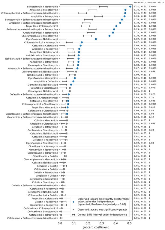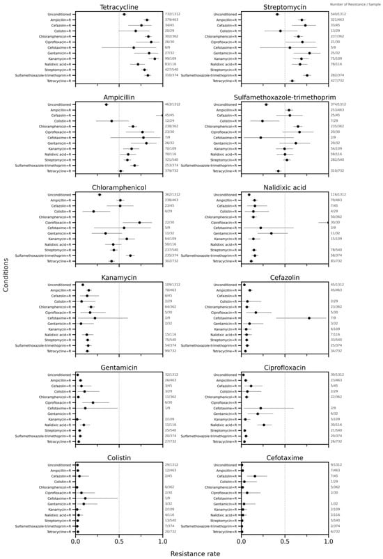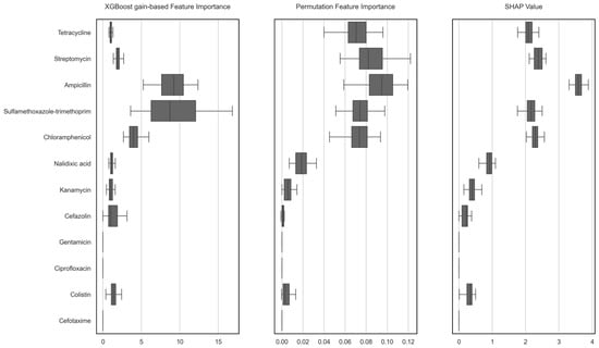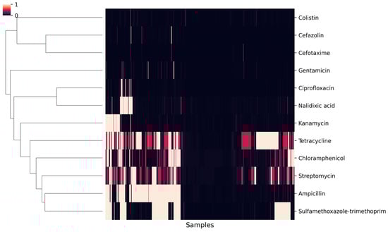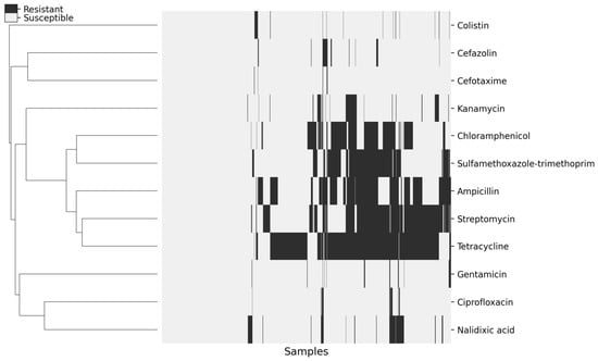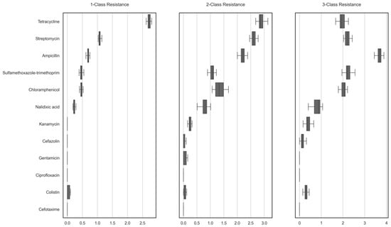 Results: Within the study period, resistance remained highest for tetracycline and moderate for streptomycin, ampicillin, sulfamethoxazole–trimethoprim, and chloramphenicol, whereas resistance to other agents was low. MIC-based correlation analysis revealed coordinated variation among ampicillin, sulfamethoxazole–trimethoprim, streptomycin, chloramphenicol, and tetracycline. Separately, Jaccard similarity of binary resistance profiles identified two closely positioned co-resistance groupings (Ampicillin/Streptomycin/Tetracycline and chloramphenicol/sulfamethoxazole–trimethoprim). Ampicillin was identified as the medoid in both MIC-based and resistance-profile similarity spaces, with streptomycin also positioned near the center in both structures. In the XGBoost model for MDR (≥3 classes), ampicillin resistance was consistently the highest-contributing feature when evaluated by gain, permutation importance, and SHAP. When we examined how SHAP-based attributions varied across outcome definitions (≥1-, ≥2-, and ≥3-class resistance), feature importance largely followed resistance prevalence at ≥1–≥2 classes (tetracycline highest) but shifted at ≥3 classes to ampicillin as the top feature.