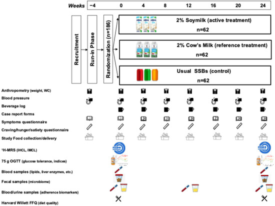 1H-MRS at 24 weeks. Hierarchical testing will be done to reduce the familywise error rate. The superiority of cow’s milk to SSBs will be assessed first to establish assay sensitivity. If superiority is established, then the non-inferiority of soymilk to cow’s milk will be assessed using a pre-specified non-inferiority margin of 1.5% IHCL units (assessed by difference of means using a 90% confidence interval [CI]). Analyses will be conducted according to the intention-to-treat (ITT) principle using inverse probability weighting (IPW) for superiority testing and per-protocol analyses for non-inferiority testing, using ANCOVA adjusted for age, sex, metabolic dysfunction-associated steatotic liver disease (MASLD) status, medication use, intervention dose, and baseline levels. We hypothesize that soymilk will be non-inferior to cow’s milk (Clinicaltrials.gov NCT05191160).
