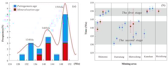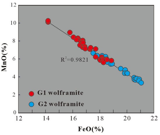 The origin of Mesozoic granites associated with the Dahutang W-Cu-Mo orefield in northern Jiangxi, which hosts the world’s second-largest tungsten deposit, remains a compelling subject despite extensive geochemical and geochronological studies. In this contribution, we present wolframite mineral and whole-rock geochemistry, as well as monazite and zircon U-Pb ages, for the Mesozoic granites to constrain our understanding of the petrogenesis of these granites and their coupling relationship with the mineralization. The following two magmatic phases and four types of rocks in the study area are identified: the early stage (152–147 Ma) biotite (G1) granites and the late stage (144–130 Ma) two-mica (G2),muscovite (G3), and albite (G4) granite series. These two magmatic phases are temporally coincident with two mineralization stages (~150 Ma and 144–139 Ma). All the Mesozoic granites share the characteristics of high silica content, peraluminosity (A/CNK > 1.1), and low Zr + Nb + Ce + Y values (<200 ppm); they are derived from the partial melting of a Proterozoic crustal source and classified as S-type granites. Specifically, the G1 granites are characterized by relatively high MgO (~0.5%), CaO (~1%), and low P