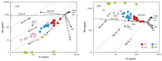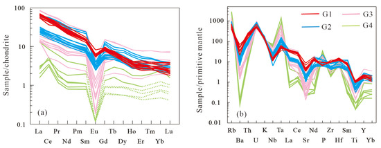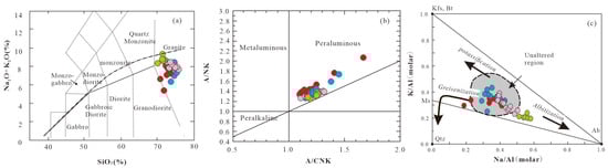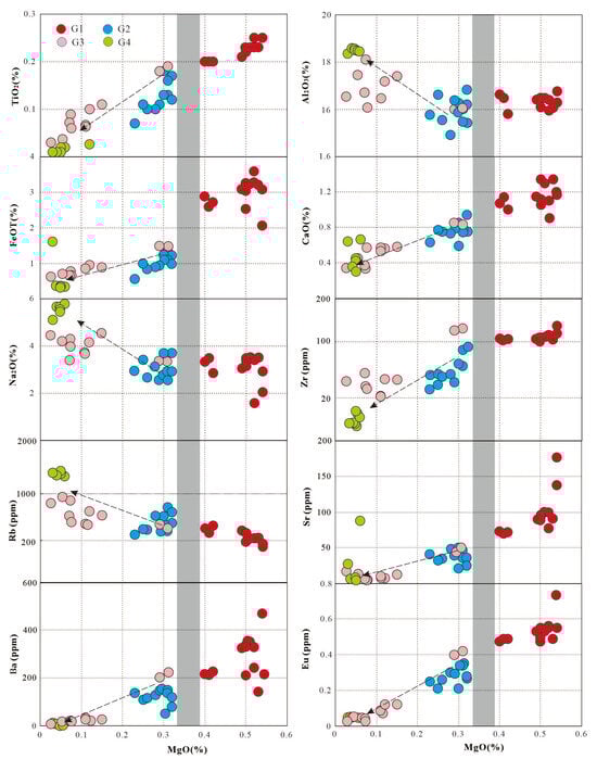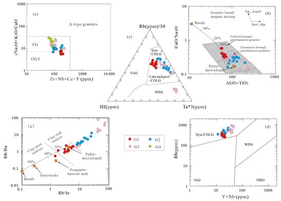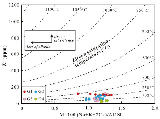 5 (0.13%–0.20%). They formed through a relatively high degree of partial melting at approximately 766 °C (zircon saturation temperatures), a process influenced by biotite dehydration reactions, with minor contributions from mantle-derived materials. In contrast, the G2–G4 granite series exhibits more typical peraluminous S-type granite features, such as high Al