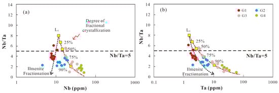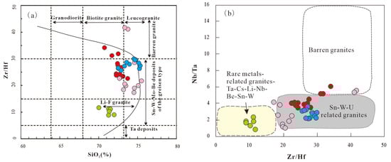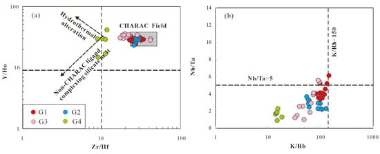 5 (mostly > 0.2%) contents, and low Sr and Ba contents. They are products of low-degree partial melting that occurred under conditions close to muscovite breakdown at ~726 °C. Additionally, fluid–melt interaction is recorded in both granites by distinctive geochemical signatures, including enrichment in Sn (>30 ppm), Cs (>35 ppm), Li (>250 ppm), F (>0.4%), and W (10–1000 ppm), coupled with low K/Rb (<150) and Nb/Ta (<5) ratios. The near-chondritic Zr/Hf (22.6–34.1) and Y/Ho (24.5–31.5) ratios of the G1 granites imply a relatively limited role of magmatic fluid–melt interaction during its evolution. For the G2–G4 granites, however, intense crystal fractionation and late-stage fluid–melt interaction are well-documented by their highly variable and low ratios of Y/Ho (14.8–41.4), Nb/Ta (0.89–5.57), Zr/Hf (8.84–41.67), and K/Rb (13.96–128.29). In the long-lived, reduced, and volatile-rich aqueous environment of the G2–G4 magmas, fractional crystallization and albitization collectively enhanced the solubility and hydrothermal transport capacity of W, Sn, Li, Nb, and Ta by multiple orders of magnitude. In contrast, in the earlier, more oxidized G1 magmas (which incorporated mantle materials), the exsolution and hydrothermal transport of Cu and Mo were associated with localized greisenization, but their capacity diminished with fractional crystallization. Historically, mineral exploration in the Dahutang mining area has focused primarily on W, Cu, and Mo. Based on this research, we conclude that there is significant mineral potential for rare metals (particularly Sn, Li, and Ta), and future exploration should prioritize areas adjacent to the evolved G2–G4 peraluminous leucogranites to search for new concealed mineral occurrences.
