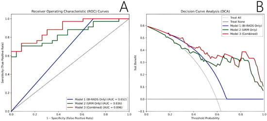 Objective: Ultrasound Resolution Microscopy (URM) is an emerging technique that provides superior delineation of tumor microvasculature. This prospective study aimed to evaluate the diagnostic value of URM in differentiating benign from malignant breast lesions. Methods: From September 2024 to October 2025, 55 patients with 57 breast masses underwent conventional ultrasound and contrast-enhanced URM. Microvascular parameters were quantitatively analyzed and cross-referenced with histopathology. To mitigate overfitting, LASSO regression was employed to screen 14 URM indices. A combined predictive model integrating core URM features with BI-RADS categorization (dichotomized at 4A) was developed and evaluated using ROC and decision curve analysis (DCA). Results: Thirty-four malignant and 23 benign masses were confirmed. Malignant lesions exhibited comprehensively elevated microvascular abundance and architectural chaos. LASSO regression distilled these features down to two core independent predictors: Vessel Count and Max Curvature. The BI-RADS-alone model yielded 100% sensitivity but extremely low specificity (30.43%). Crucially, the Combined model significantly outperformed the single-modality approaches, achieving an excellent AUC of 0.896 (vs. 0.652 for BI-RADS alone, p < 0.001). By integrating URM parameters, the Combined model maintained adequate sensitivity (73.53%) while drastically boosting specificity to 91.30%. DCA confirmed superior net clinical benefit for the combined strategy. Conclusions: Quantitative URM imaging effectively characterizes the distinct microvascular features of breast cancers. Integrating URM functional parameters with conventional BI-RADS categorization significantly improves diagnostic specificity. Consequently, this combined approach provides a reliable non-invasive strategy to optimize risk stratification, effectively minimizing false-positive diagnoses and averting unnecessary invasive biopsies in routine clinical practice. Full article
