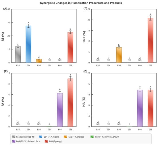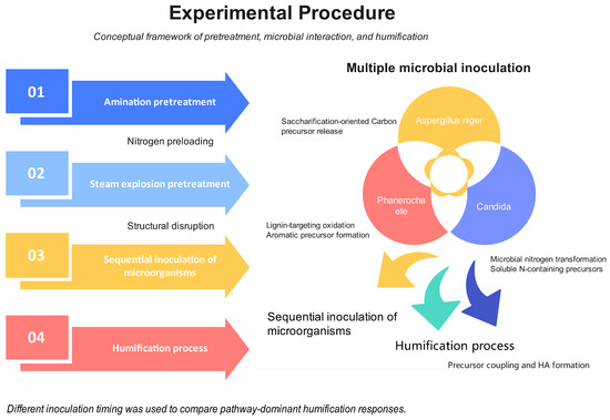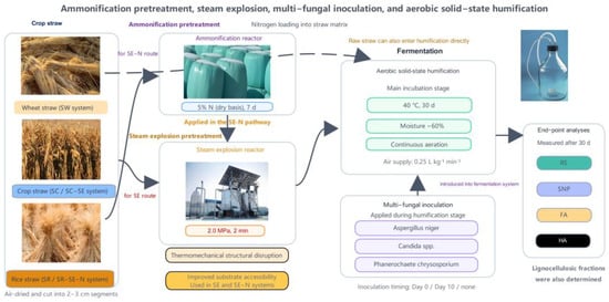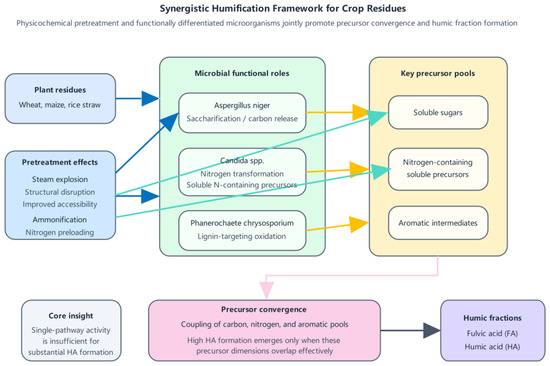 The pathways governing the transformation of crop residues into humic acid (HA) remain incompletely understood because multiple biochemical routes may operate simultaneously during composting-like humification. In this study, a 30-day solid-state humification experiment was conducted by integrating physicochemical pretreatments, including steam explosion (SE) and ammonification coupled with steam explosion (SE-N), with a multi-fungal inoculation strategy involving Aspergillus niger, Candida spp., and Phanerochaete chrysosporium. Across three representative substrate–pretreatment systems and 81 experimental groups, the contents of lignocellulosic fractions, reducing sugars (RS), a UV-280-based soluble nitrogen-containing precursor index (operationally denoted as SNP), fulvic acid (FA), and HA were compared. The results showed that neither physicochemical pretreatment alone nor single-strain inoculation was sufficient to achieve substantial HA formation. SE mainly improved substrate accessibility and promoted carbon release, whereas ammonification provided essential nitrogen preloading for subsequent precursor coupling. In the saccharification-dominant treatment, RS reached 27.5%, but HA remained negligible. In the Candida-only treatment, the soluble nitrogen-containing precursor index increased markedly, yet HA formation was still minimal. By contrast, the highest HA yield (13.7%) was obtained under multi-fungal co-inoculation, particularly when nitrogen preloading by ammonification was combined with concurrent accumulation of carbon and aromatic precursors. The data suggest that lignin-targeting activity by P. chrysosporium was associated with the likely generation of phenolic and quinone-like intermediates that bridged the condensation of sugar- and nitrogen-derived compounds. Overall, the findings support a synergistic humification framework in which polysaccharide depolymerization, microbial nitrogen transformation, and lignin-derived aromatic precursor formation jointly contribute to HA accumulation, rather than a single linear pathway dominating the process. Full article