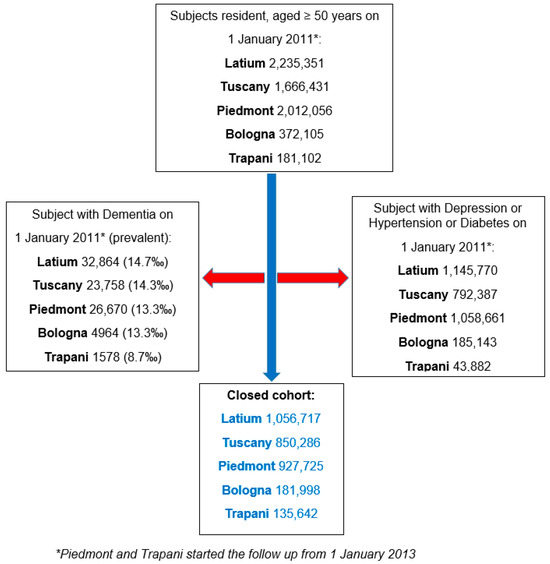 Background/Objectives: Dementia is a major public health challenge, with age as its primary non-modifiable risk factor. Several modifiable conditions, such as hypertension, diabetes, and depression, have been identified as potential targets for prevention. The aim is to describe the methodology and preliminary results of a study that will be conducted within the Italian National Health Service (INHS), designed to assess the impact of hypertension, diabetes, depression, and their interactions on the onset of dementia. Methods: This population-based cohort study, part of the PREV-ITA-DEM project, was conducted using a Common Data Model (CDM) approach across five Italian regions and cities participating in the NeuroEpiNet network. Individuals aged ≥ 50 years without prior diagnoses of dementia, depression, diabetes, or hypertension were followed from cohort entry (2011–2013) until dementia diagnosis, death, emigration, or study end (2019–2022). Exposures were time-dependent and defined using validated algorithms applied to Healthcare Utilization Databases (HUDs). Associations between chronic conditions and dementia risk will be estimated using competing risks regression models adjusted for confounders. Results: The final cohort comprised more than 3 million individuals, with a mean baseline age of 63–65 years and a female proportion of 52–55%. On 1 January 2011, the prevalence of individuals aged ≥ 50 years with dementia ranged from 8.7 to 14.7 per 1000 population. A harmonized methodological framework based on a CDM was developed and implemented across all sites, incorporating a shared protocol, standardized local databases, and uniform analytic scripts, and the results will be pooled using meta-analytic techniques. Conclusions: Preliminary findings confirm the feasibility of a standardized, multi-regional CDM approach and the potential for HUDs to support large-scale dementia prevention studies in real-world settings. Full article