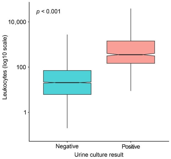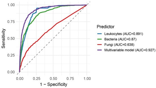 Background/Objectives: Urine samples are the most frequently analyzed specimens in clinical microbiology laboratories. Although urine culture remains the gold standard for diagnosing urinary tract infections, it is time-consuming and resource-intensive. Therefore, reliable screening methods capable of predicting urine culture positivity are needed to optimize laboratory workflow. Automated urine analysis based on flow cytometry enables efficient screening and identification of samples with a low probability of bacterial infection, thereby rationalizing microbiological testing. This study evaluated the usefulness of a multivariable approach to support interpretation of flow cytometry results following the implementation of the Sysmex UF-4000 urine flow cytometer. Methods: Routinely collected urine samples from outpatients and hospitalized patients were analyzed using the UF-4000 flow cytometer, with a positivity threshold of ≥100 leukocytes/µL. Urinary parameters were compared between samples with positive and negative cultures. Multivariable logistic regression was applied to identify independent predictors of a positive urine culture. Urinary sediment parameters, including leukocyte, bacterial, fungal, and squamous epithelial cell counts, were assessed as covariates. Results: Urine samples with positive cultures showed significantly higher leukocyte counts (median 355.0, IQR 146.5–1429.4) and bacterial counts (median 9805.2, IQR 1134.3–45,011.5). Fungal and squamous epithelial cell counts differed only slightly between groups, although the differences were statistically significant (p < 0.001). Leukocyte counts were higher in urine samples from which Gram-negative bacteria were isolated compared with samples containing Gram-positive bacterial isolates (p < 0.001). The multivariable model demonstrated the most favorable overall performance, combining high sensitivity with improved specificity and the highest negative predictive value (AUC = 0.927). Optimal cut-off values were 70 leukocytes/µL and 105 bacteria/µL. Conclusions: Leukocyte and bacterial counts were the strongest predictors of positive urine culture results. A multivariable model including only these two parameters demonstrated high diagnostic accuracy and may serve as a practical screening tool to identify urine samples with a low probability of bacterial infection. The implementation of this approach could support more efficient use of urine cultures and help optimize laboratory workflow. Full article