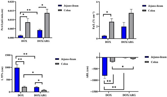 Background/Objectives: Doxorubicin is an anthracycline chemotherapeutic agent widely used in the treatment of breast cancer. However, its clinical utility is limited by the drug’s resistance development, low oral bioavailability, and dose-dependent side effects. The semi-essential amino acid, L-arginine, has gained attention as a potential adjuvant that could improve the drug distribution and cytotoxic effectiveness of chemotherapeutics. This study aimed to explore the multifunctional effect of L-arginine on the intestinal absorption and anti-breast cancer activity of doxorubicin. Methods: The rabbit in situ intestinal perfusion technique was employed to investigate the membrane transport parameters of doxorubicin both in the absence and presence of L-arginine. Furthermore, the effect of L-arginine on the cytotoxic activity of doxorubicin against breast cancer cells (MCF-7) was assessed using the MTT assay. Results: Co-perfusion of L-arginine with doxorubicin enhanced the fraction of doxorubicin absorbed, with a recorded 4.3-fold enhancement in the jejuno-ileum and a 1.5-fold enhancement in the colon segment. In MCF-7 cells, co-treatment with L-arginine resulted in a significant potentiation of doxorubicin cytotoxicity. At L-arginine concentrations of 10 μM and 50 μM, the recorded IC50 decreased from 41.3 μM to 8.2 μM and to 22.1 μM, respectively. The superior efficacy of 10 μM L-arginine compared to 50 μM reflected a biphasic concentration-dependent response. Conclusions: L-arginine modulated two critical aspects of doxorubicin efficacy, intestinal absorption and cytotoxic activity. The biphasic response emphasizes the importance of L-arginine dose optimization. These findings support the potential of L-arginine as a safe adjuvant for developing oral doxorubicin formulations. This approach can reduce the dose-related toxicity of doxorubicin and improve therapeutic outcomes. Full article