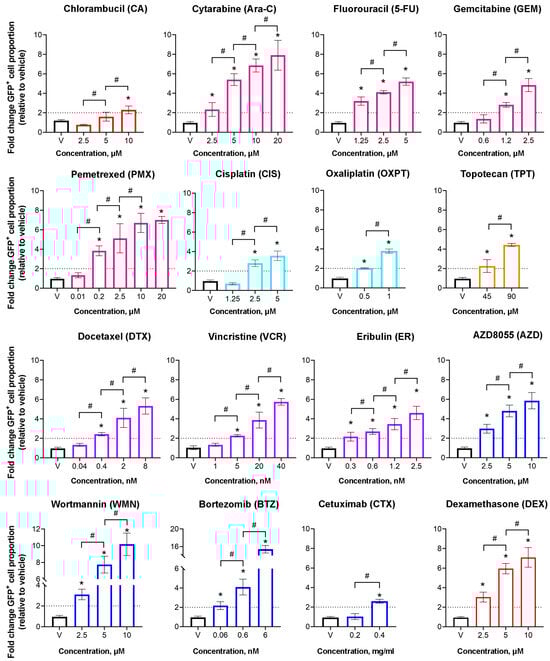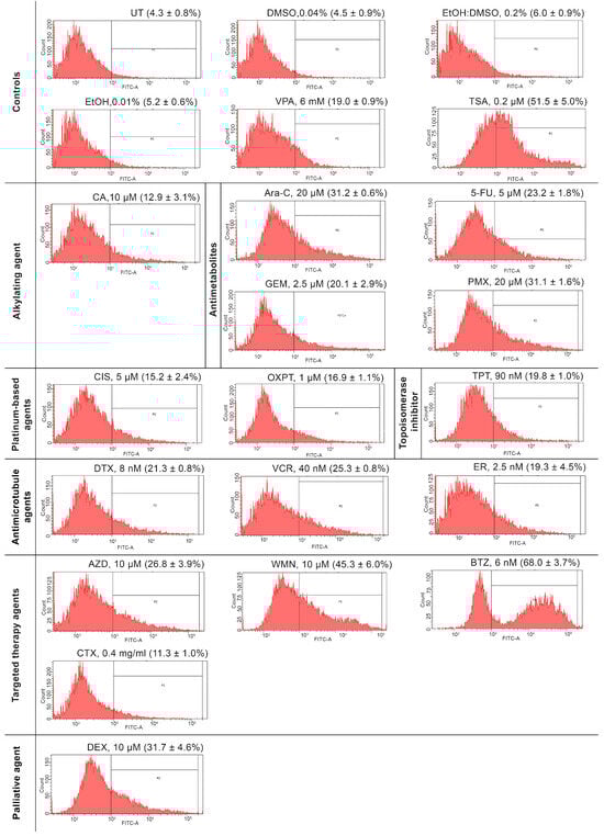 Background/Objectives: The aberrant epigenetic landscape of cancer cells has attracted wide attention, motivating the search for new epigenetically active drugs both for anticancer therapy and for overcoming the drug resistance promoted by epigenetic changes. The use of epi-drugs in cancer therapy requires consideration of the influence of applied treatment on epigenetic regulation of gene expression. Therefore, it is reasonable to screen epigenetically active compounds among the drugs widely used in clinical oncology. Methods: We applied the HeLa TI cell-based assay to analyze the epigenetic activity of 40 drugs including 22 chemotherapeutic, 2 immunotherapeutic, 13 targeted, and 3 palliative agents. Reactivation of the epigenetically silenced GFP reporter gene integrated into the genome of HeLa TI cells was assessed using flow cytometry. Results: Statistically significant increases in the proportions of GFP-positive cells were demonstrated for the alkylating agent chlorambucil; the antimetabolites cytarabine, fluorouracil, gemcitabine, and pemetrexed; the platinum-based compounds cisplatin, and oxaliplatin; the topoisomerase inhibitor topotecan; and the antimicrotubule agents docetaxel, vincristine, and eribulin. Epigenetic activity was also detected for the targeted-therapy agents AZD8055, wortmannin, and cetuximab, as well as for the corticosteroid dexamethasone. Thus, epigenetic activity was revealed for 15 drugs widely used in cancer therapy, which possess different modes of action. Conclusions: Our findings show that many anticancer therapy agents modulate the epigenetic landscape of cancer cells, providing a rationale for expanding their therapeutic applications and enhancing the efficacy of combination strategies by overcoming epigenetically driven chemoresistance. Full article