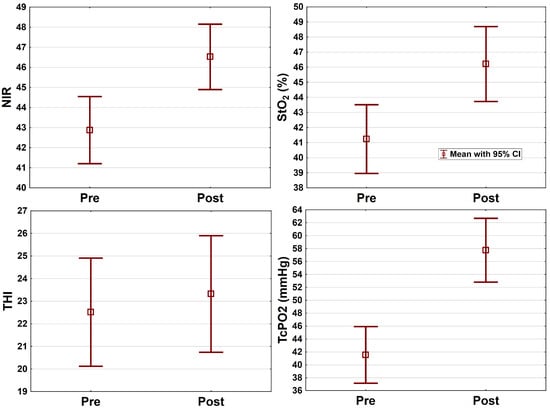 Background/Objectives: Hyperspectral imaging (HSI) facilitates noninvasive assessment of tissue perfusion in patients with peripheral arterial disease. However, available studies are either based on small cohorts and provide no comparison to standard methods or only one-time measurements. Methods: In this prospective cohort study, assessment of tissue perfusion with transcutaneous oxygen pressure (TcPO2) measurement and HSI before (1 day) and after revascularization (1–3 days) in patients with Rutherford category 3–6 was performed. The primary endpoint was change in tissue perfusion evaluated with the different methods. HSI and TcPO2 were correlated with clinical improvement after revascularization. Results: Significant improvement in the perfusion was detected by tissue oxygenation in the microcirculation (StO2; improvement +12%, mean difference 5 ± 15.9, p < 0.001) and near-infrared spectroscopy (NIR; improvement +9%, mean difference 3.7 ± 7.1, p < 0.001), but not with the tissue hemoglobin index (THI; mean difference +0.8 ± 10.3, p = 0.428). A high number of worse or unchanged HSI measurements despite successful revascularization was detected. A significant improvement of TcPO2 after revascularization (mean difference +16.2 ± 27.7 mmHg, p < 0.001), consistent with clinical improvement, was detected. No correlation of the HSI parameters with TcPO2 or clinical symptoms could be seen. Conclusions: Significant improvement of StO2, NIR and TcPO2 values was detected after successful revascularization; however, no correlation of HSI parameters with TcPO2 or clinical results could be observed. Furthermore, the substantial rate of lower or unchanged HSI parameters despite clinical improvement and higher TcPO2 values calls the validity and clinical relevance of TIVITA®-based HSI measurements for postoperative tissue perfusion improvement into question. Full article