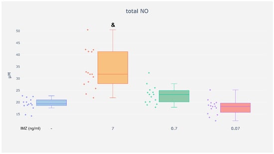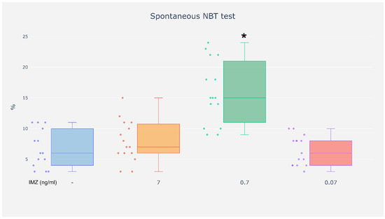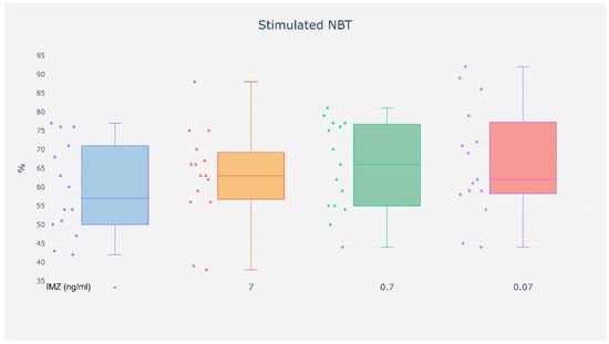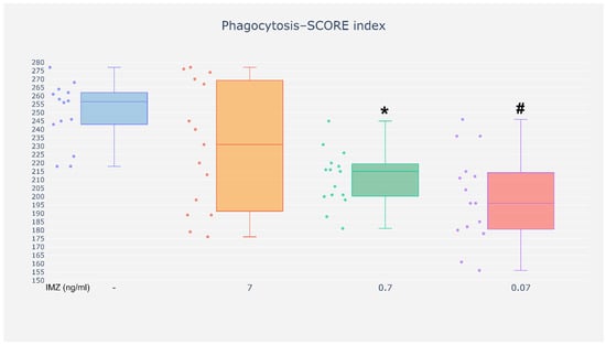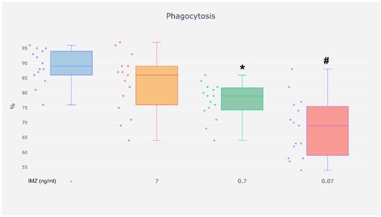 Neutrophils are the most numerous population of peripheral blood leukocytes and play a key role in innate immunity, participating in antibacterial, antifungal, antiviral, and antitumor responses. Their activity can be modulated by endogenous and exogenous factors, including pesticides, among which fungicides such as the commonly used imazalil (IMZ) constitute a significant group. The objective of this study was to assess the effect of IMZ (at an environmental dose of 0.07 ng/mL, as well as 10- and 100-fold higher doses) on selected functions of neutrophils. This study demonstrated that neutrophils incubated with IMZ at a dose detectable in the serum, exhibited lower phagocytotic capacity. In addition, at a 10-fold higher dose, this compound reduced the chemotactic capacity of neutrophils and led to increased activity of NADPH oxidase in these cells. Furthermore, it was observed that at the highest concentration used in this study IMZ intensified the production of nitric oxide. The exposure of neutrophils—the first line of defense—to IMZ affected their locomotion and pathogen-eliminating function. Moreover, the response of neutrophils was not proportionate to the concentration of IMZ used in the study. Full article