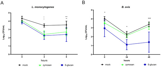 Background/Objectives: Trained innate immunity refers to the enhanced responsiveness of innate immune cells, particularly macrophages, following exposure to stimuli such as β-glucan or zymosan, enabling improved defense against unrelated pathogens. This phenomenon has been widely investigated to better understand host–pathogen interactions and to support the development of improved infection control strategies. This study evaluated whether these training stimuli could enhance the protective efficacy of attenuated or inactivated vaccine models against Brucella ovis and Listeria monocytogenes infection. Methods: Trained innate immunity was induced in vivo using β-glucan or zymosan, and seven days later mice were vaccinated with attenuated or gamma-irradiated formulations and subsequently challenged with B. ovis or L. monocytogenes. Vaccine-induced protection and immune responses were assessed through multiple experimental approaches. Results: β-glucan significantly reduced bacterial infection in vitro in bone-marrow-derived macrophages and in vivo in target organs compared with zymosan. Although β-glucan did not enhance the efficacy of the attenuated B. ovis ΔabcBA vaccine, it markedly reduced bacterial colonization in mice vaccinated with gamma-irradiated B. ovis. β-glucan also did not improve the efficacy of the gamma-irradiated L. monocytogenes vaccine; however, 50% of the trained and vaccinated mice showed no detectable bacterial recovery. Increasing the number of β-glucan doses negatively affected infection control, suggesting that overstimulation may impair trained immunity. Conclusion: Trained innate immunity enhances the protective effect of inactivated experimental vaccines against B. ovis and L. monocytogenes, while exerting a detrimental influence on the efficacy of a live attenuated B. ovis vaccine model. Full article