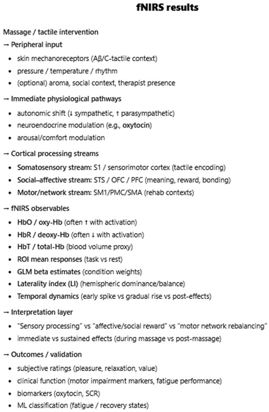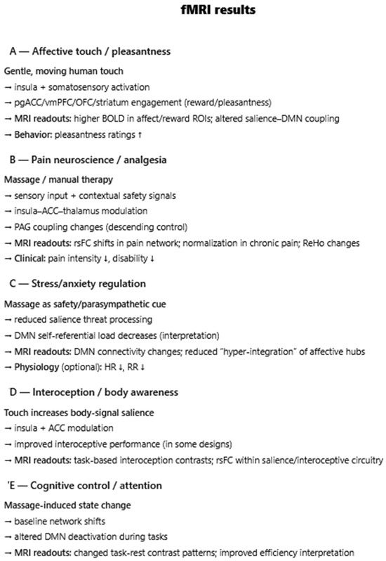 Introduction: Massage therapy delivers structured mechanosensory input that can influence brain function, yet the central mechanisms and potential for neuroplastic change have not been synthesized across neuroimaging modalities. This mechanistic review integrates evidence from electroencephalography (EEG), functional MRI (fMRI), and functional near-infrared [...] Read more.