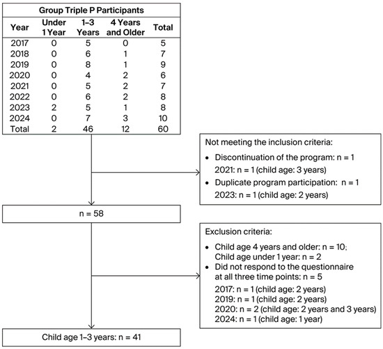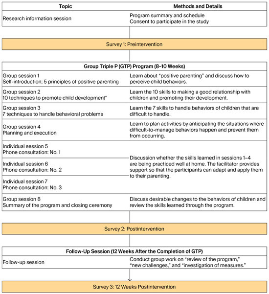 Background/Objectives: The Positive Parenting Program (Triple P) is an evidence-based intervention for families including young children with neurodevelopmental disorders. Because establishing a definitive diagnosis in early childhood takes time, especially for 1–3-year-olds who have only recently shown early signs, parents often experience substantial stress. This study examines the effectiveness of the Group Triple P (GTP) program for mothers of 1–3-year-old children without a confirmed diagnosis who spent time at a community parenting support center. Methods: The participants were 41 mothers of children aged 1–3 who did not confirmed neurodevelopmental diagnosis but showed behavioral, emotional, or developmental concerns, or whose mothers reported parenting difficulties. To reflect real community practices, a non-randomized pre–post test design without a control group was adopted. Assessments were conducted at baseline, postintervention, and at a 12 weeks follow-up using the Strengths and Difficulties Questionnaire, Parenting Scale, Parenting Experience Scale, and Depression Anxiety Stress Scale. Results: GTP improved the mothers’ assessments of positive behaviors in children who may have neurodevelopmental disorders, with a medium effect size. GTP reduced dysfunctional parenting styles in mothers with a large effect size. It also enhanced mothers’ confidence and fulfilling sense in parenting, and decreased depression and stress with a medium effect size. Perceived access to parenting support improved, contributing to better parenting adaptation with a medium effect size. Conclusions: GTP may serve as an early public health intervention for mothers of young children who may have neurodevelopmental disorders by supporting maternal mental health and promoting adaptive parenting. Full article