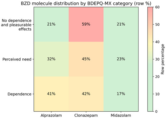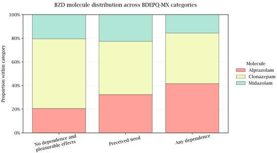 2, Student’s t, and one-way ANOVA. A logistic regression modeled any dependence; a general linear model (GLM) examined the BDEPQ-MX total score. Results: Of 181 complete cases, BDEPQ-MX categories were No dependence 33.2% (60/181), Pleasurable effects 7.2% (13/181), Perceived need 17.1% (31/181), and Dependence 42.5% (77/181); hence, 59.7% met “any dependence.” Women comprised 67.4% overall. Compared with No dependence, the any-dependence group had higher comorbidity (83.3% vs. 65.8%,