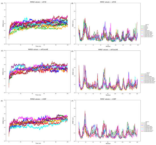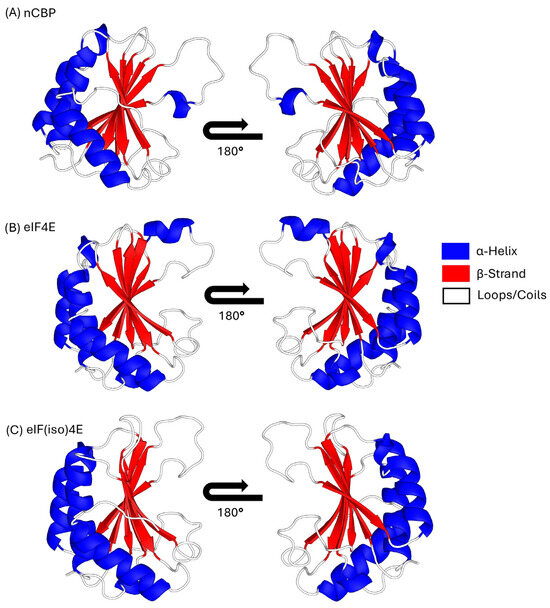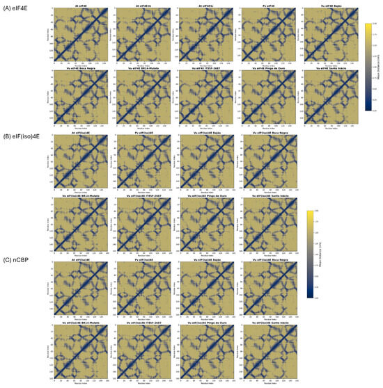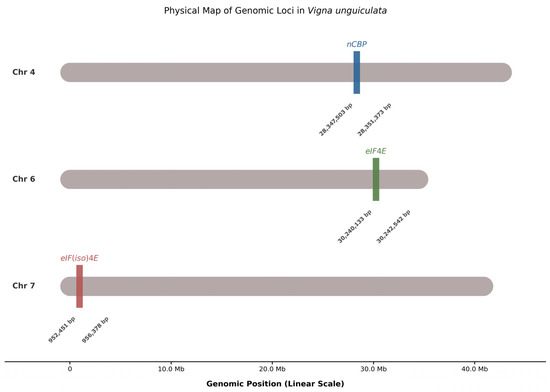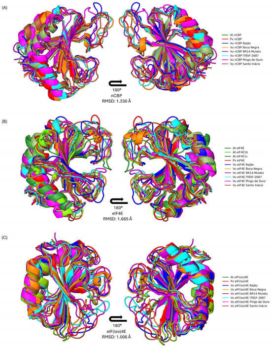 The eukaryotic translation initiation factor 4E (eIF4E) family plays a dual role in plants, regulating cap-dependent protein synthesis and mediating susceptibility to viruses in the family Potyviridae. In cowpea (Vigna unguiculata (L.) Walp.), an economically important legume cultivated worldwide, the structural determinants of these isoforms remain largely unexplored. This study characterizes the genomic organization, evolutionary history, and conformational dynamics of eIF4E, eIF(iso)4E, and nCBP in cowpea using a multi-omics approach. Genome mining identified three paralogous genes located on chromosomes 4, 6, and 7, showing high synteny with Phaseolus vulgaris. Phylogenetic analysis confirmed nCBP as the ancestral Class I lineage, distinct from the Class II eIF4E and eIF(iso)4E clades. Theoretical models for the isoforms were generated and subsequently validated by molecular dynamics simulations, revealing that while all isoforms preserve the canonical tertiary architecture and an electropositive cap-binding pocket, eIF(iso)4E exhibits superior structural compactness and hydrogen-bond stability. These biophysical features highlight their role as a stable anchor for viral VPg proteins. By elucidating the atomic-level landscape of these factors, we provide a robust structural framework to guide allele mining and genome-editing strategies aiming to engineer virus-resistant cowpea cultivars without compromising agronomic performance. Full article
