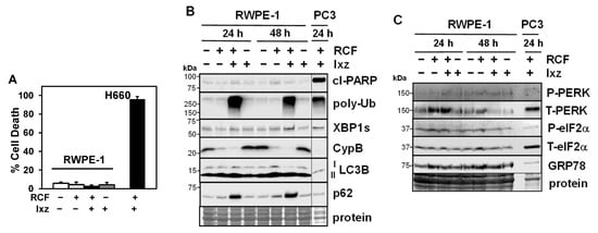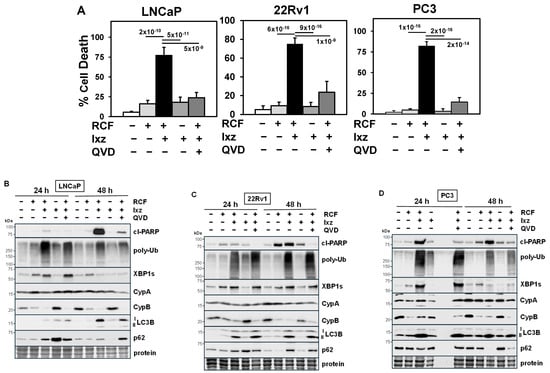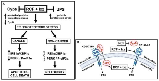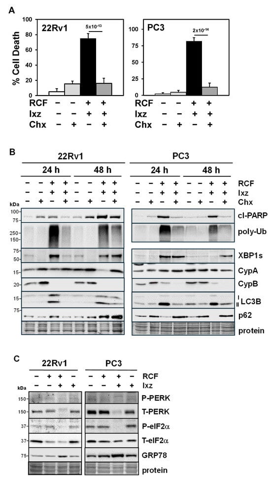 Background/Objective: Proteotoxic stress induced by inhibitors of the ubiquitin–proteasome system has been successful in multiple myeloma but not in solid cancers such as prostate cancer. Our objective is to find a combination with proteasome inhibitors that increases apoptotic cell death in all types of prostate cancer without harming non-cancer cells. Methods: The effectiveness of rencofilstat, a pan-cyclophilin inhibitor, combined with the ixazomib proteasome inhibitor, was investigated in multiple prostate cancer and non-cancer cells. Inducible knockdown of stress response XBP1s and cyclophilins A/B and inducible expression of XBP1s and cyclophilin B were developed in prostate cancer to determine functional roles. Results: Rencofilstat + ixazomib increased apoptotic cell death in prostate cancer but not in non-cancer cells. We investigated the effects on XBP1s and PERK, important unfolded protein response factors required for cells to survive proteotoxic stress. The results revealed that XBP1s had a pro-survival role early, but maintenance at later times of rencofilstat + ixazomib treatment resulted in cell death. In addition, decreased PERK and phospho-eIF2α likely maintained protein synthesis to further enhance proteotoxic stress. In contrast, rencofilstat + ixazomib did not alter XBP1s or PERK in non-cancer cells. Additional genetic experiments showed that the RCF targets cyclophilins A, B, and D had protective effects. Rencofilstat increased extracellular secretion of cyclophilin B, but rencofilstat + ixazomib reduced glycosylation and, likely, the biological function of CD147 (CypB receptor) and decreased downstream ERK signaling. Conclusions: Rencofilstat + ixazomib may be a new strategy for increasing proteotoxic stress and apoptotic cell death in advanced prostate cancer cells with less toxic side effects. Full article