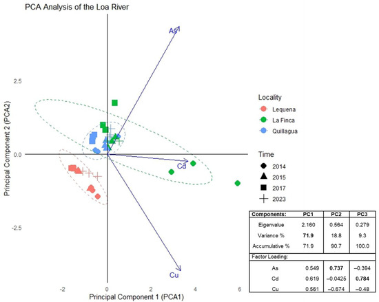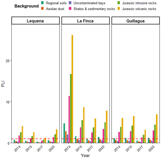 The Atacama Desert in northern Chile is characterized by its naturally high metal concentrations; however, human activities have significantly increased their availability and concentration in aquatic environments. In the Loa River basin, copper mining is the main economic activity, and the extremely arid conditions contribute to high levels of evaporation and salinity. This study evaluated the concentrations of As, Cd, and Cu in the 63 µm sediment fraction from three areas, Lequena, La Finca, and Quillagua, during the years 2014, 2015, 2017, and 2023. Contamination levels were assessed using multiple approaches, including the Geoaccumulation Index (Igeo), the Enrichment Factor (EF), the Pollution Load Index (PLI), and the mean Probable Effect Concentration Ratio (m-PEC-Q). The results showed that Lequena (upper river zone) had no evidence of anthropogenic contamination over time; however, the ecological risk assessment highlighted the significant natural contribution of arsenic, representing a potential risk to the ecosystem. In contrast, La Finca (mid-river zone) and Quillagua (river mouth) showed significantly high levels of contamination. The Geoaccumulation Index consistently classified these sites as “moderately” to “heavily” contaminated or “heavily contaminated” for arsenic, while the Enrichment Factor indicated “very high enrichment” for arsenic, reflecting a strong anthropogenic influence. Ecological risk assessments indicated a persistent 76% probability of toxicity at La Finca throughout all sampling years, a level also observed at Quillagua in 2017 and 2023, with concentrations frequently exceeding international sediment quality guidelines. These patterns are attributed to the proximity of mining activities in the middle zone and the downstream transport of contaminated sediments to the river’s mouth, resulting in persistently high ecological risks over time. This study provides important baseline information for pollution control and ecological safety in the Loa River basin. Full article