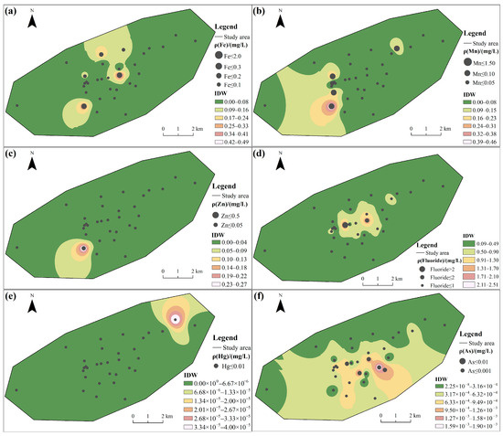 The contamination of groundwater in karst coal mining areas presents a unique environmental challenge due to the interplay between fragile hydrogeology and intensive anthropogenic activity. This study investigated the concentrations, sources, and health risks of characteristic contaminants in groundwater from a karst coal mining area, aiming to provide a scientific basis for groundwater pollution control. Thirty-two groundwater samples were analyzed for nine target contaminants. Principal component analysis (PCA) and a health risk assessment model were integrated to identify pollution sources and evaluate health risks. Results showed that the concentrations of Fe, Mn, Fluoride, Pb, and Sulfate exceeded the Class III limits of the “Standard for Groundwater Quality” (GB/T 14848-2017), with maximum exceedance multiples of 3.60, 1.51, 1.08, and 1.22 times the standard limits, respectively. The maximum concentrations of Mn, Fluoride, and Pb exceeded the WHO guidelines by factors of 4.75, 0.67, and 1.00, respectively. Furthermore, the Pb concentration also surpassed the USEPA standard by a factor of 0.33. PCA identified three principal components, which together explained 71.065% of the total variance and were attributed to mining activities (PC1), mixed natural and anthropogenic sources (PC2), and natural geological processes (PC3), respectively. The health risk assessment reveals significant risks: arsenic poses a carcinogenic risk (CR > 10−4), while both arsenic and Fluoride contribute to non-carcinogenic risks (HI > 1). The cumulative exposure from these contaminants demands immediate attention. Full article
