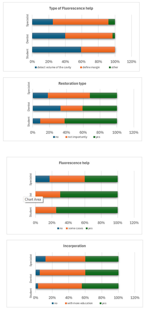 Background/Objectives: Caries adjacent to restorations remain a leading cause of restoration failure and replacement. Conventional diagnostic methods are limited by subjectivity and restricted visualization. Fluorescence-enhanced three-dimensional (3D) imaging has been proposed to improve detection accuracy, but evidence on its clinical perception and usability remains scarce. The objective of this study was to evaluate the perceived diagnostic value of fluorescence-enhanced 3D imaging in detecting caries adjacent to direct restorations. Methods: A cross-sectional questionnaire-based survey was distributed to undergraduate dental students and licensed dentists (n = 94). Participants assessed images of extracted teeth with direct restorations presented in three formats: conventional photographs, monochromatic 3D models, and 3D models with fluorescence. Responses were analyzed using descriptive statistics, chi-square tests, and Cohen’s kappa to measure inter-rater agreement. Results: Overall, 64.9% of respondents reported that fluorescence-enhanced images improved their diagnostic decision-making, while 29.8% reported partial benefit. Fluorescence was mainly perceived as helpful in defining cavity margins (53.3%) and assessing lesion volume (42.4%). Most participants preferred 3D models with fluorescence over conventional images for diagnostic value. However, inter-rater agreement was generally poor (κ range: –0.05 to 0.25; median κ = 0.02; only 4 images showed weak but statistically significant agreement), with only a few images demonstrating weak but statistically significant agreement. Notably, 39.3% of participants reported prior experience with 3D imaging, which was associated with greater confidence in interpreting fluorescence-enhanced images. Participants with prior 3D imaging experience reported greater confidence in fluorescence interpretation. Conclusions: While fluorescence-enhanced 3D imaging is perceived as a useful adjunct for visualizing lesion margins and depth, it does not currently yield consistent diagnostic agreement across clinicians. Training, calibration, and integration of artificial intelligence support may enhance the clinical reliability of this technology. Full article