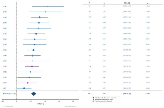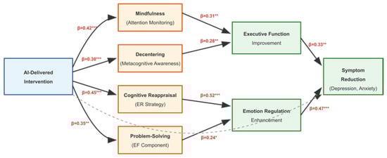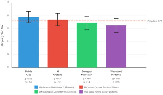 Background: The global burden of mental disorders continues to escalate, necessitating scalable, evidence-based interventions. Artificial intelligence (AI)-delivered health promotion programs represent a promising approach to addressing treatment gaps by targeting the neuropsychological mechanisms that underlie mental health outcomes. This meta-analysis synthesizes evidence on the effectiveness of AI-delivered interventions in improving executive function, emotion regulation, and clinical outcomes across diverse populations. Methods: A systematic search identified 186 studies (n = 22,755 participants) published between 2020 and 2025. Random-effects meta-analyses estimated pooled effect sizes (Hedges’ g, calculated as between-group standardized mean differences with small-sample correction [J = 1 − 3/(4df − 1)]) for primary outcomes. Between-study heterogeneity was quantified using I2 and τ2 statistics. To address dependency among effect sizes from studies reporting multiple outcomes, robust variance estimation (RVE) was employed. Subgroup analyses examined intervention modalities, delivery formats, and clinical populations. Moderator analyses explored sources of heterogeneity, including publication year, sample size, intervention duration, control condition type, risk-of-bias rating, geographic region, and AI sophistication tier, and mediational models tested putative therapeutic mechanisms. Results: AI-delivered interventions demonstrated a significant overall effect on health outcomes (g = 0.68, 95% CI [0.58, 0.78]; τ2 = 0.12; I2 = 73.4%). Executive function outcomes showed moderate effects (g = 0.61, τ2 = 0.08), with working memory improvements being strongest (g = 0.72). Emotion regulation outcomes demonstrated moderate-to-large effects (g = 0.61, 95% CI [0.51, 0.70], τ2 = 0.006); formal subgroup pooled estimates by emotion regulation strategy were not calculated due to insufficient studies per strategy (k < 3 per category); individual study effect sizes ranged from g = 0.27 to g = 1.11. Among 41 studies examining neuropsychological mechanisms, convergent patterns suggested involvement of prefrontal neural circuits (DLPFC), enhanced alpha-band activity, and improved heart rate variability; however, formal mediation was tested in only 18 studies (9.7%). Among clinical populations, interventions for cognitive impairment yielded the largest effects (g = 1.02; this finding should be interpreted cautiously given modest cumulative sample size [n = 482], potential small-study effects [Egger’s p = 0.08], and trim-and-fill adjusted estimate of g = 0.85), followed by mental health conditions (g = 0.72), while other clinical populations showed smaller but significant improvements (g = 0.19). Mobile applications (g = 0.78) and chatbot-based interventions (g = 0.74) demonstrated the strongest effects among delivery formats. Among studies testing formal mediation, analyses suggested mindfulness (β = 0.42), decentering (β = 0.38), and cognitive reappraisal (β = 0.45) as processes associated with therapeutic outcomes. Conclusions: AI-delivered health promotion programs demonstrate significant effectiveness across executive function, emotion regulation, and clinical outcomes, though substantial heterogeneity (I2 = 45–82%) indicates meaningful variability warranting attention to subgroup-specific effects. Given the diversity of intervention types included (chatbots, mobile apps, VR systems, neuromodulation), pooled estimates should be interpreted as characterizing the average effect across this heterogeneous landscape; subgroup-specific estimates provide more precise guidance for clinical decision-making regarding specific modalities. Effects are associated with convergent patterns of neuropsychological mechanisms, though mechanistic conclusions remain preliminary given that only 22% of studies (41/186) examined neuropsychological mechanisms, and formal mediation analyses were conducted in only 18 studies (9.7%); most of the mechanistic evidence is correlational rather than causal. Future research should establish standardized AI taxonomies, optimize adaptive algorithms, conduct adequately powered replication studies in populations with cognitive impairment, prioritize experimental mediation designs to establish causal pathways, and evaluate long-term maintenance effects with a minimum of 6–12-month follow-up periods. Full article