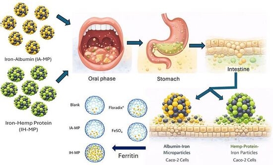 Background: Iron deficiency remains a major nutritional challenge, partly due to the limited stability and bioavailability of conventional iron formulations in foods and during digestion. In this study, iron–protein microparticles (IP-MPs) based on bovine serum albumin (IA-MPs) and hemp protein (IH-MPs) were developed via coprecipitation and evaluated as food-compatible iron delivery systems. Methods: Iron–protein microparticles (IP-MPs) were fabricated by a coprecipitation technique. The stability of IP-MPs was investigated in a three-phase digestion model. The uptake of IP-MPs by Caco-2 cells as well as the Ferritin concentration in Caco-2 cells were investigated. Results: Particle morphology and size distribution were strongly dependent on the protein matrix, with hemp protein microparticles exhibiting greater size uniformity and higher stability under simulated gastric conditions. In a standardized in vitro gastrointestinal digestion model, both IP-MP formulations preserved iron predominantly in the bioactive Fe(II) state and remained sufficiently intact to reach the intestinal phase. Biocompatibility and iron uptake were assessed using Caco-2 cell monolayers. Neither formulation induced cytotoxic effects, while iron delivered via IP-MPs showed enhanced cellular uptake compared to a commercial iron supplement and ferrous sulfate. The amount of Fe(II) detected in the basolateral compartment of IH-MP and IA-MP samples (1.4 µg and 1.3 µg, respectively) was higher than that observed for Floradix® samples (approximately 0.7 µg) and corresponded to about 25% of the total iron applied. Functional iron bioavailability, assessed by ferritin formation, was significantly higher for IP-MPs, with hemp protein microparticles yielding the strongest ferritin response. Conclusions: These results demonstrate that iron–protein microparticles, particularly those based on hemp protein, effectively improve iron stability during digestion and enhance cellular iron bioavailability, highlighting their potential for application in iron fortification and functional food systems. Full article
